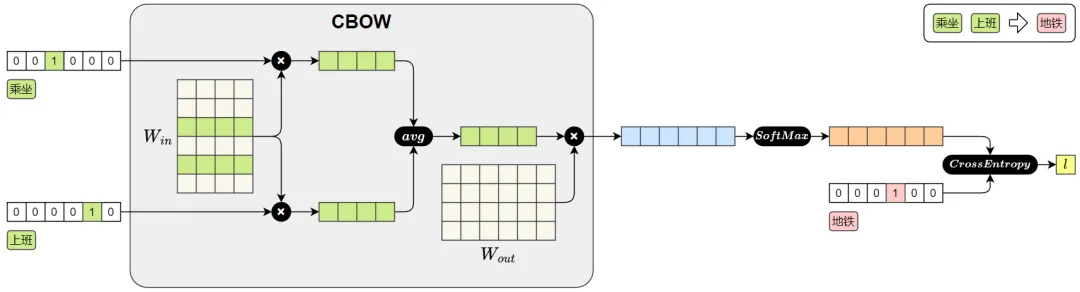 第五步,算损失,看电脑猜得准不准,不能凭感觉,得有明确的评判标准。我们拿电脑预测出来的概率,和真实的上下文词——“乘坐”和“上班”做对比,看两者之间的差距,这个差距就是“损失”。具体来说,就是计算交叉熵损失,再把这些差距加起来,得到总损失。损失越大,说明电脑猜得越差;损失越小,说明电脑猜得越准,后续只要根据这个损失,慢慢调整Win和Wout,就能让电脑越学越精准。