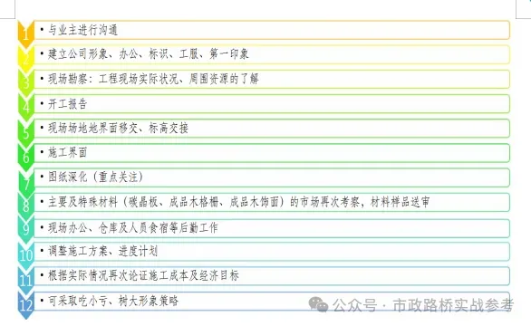 该阶段的施工任务主要有:①组织人员和设备进场;②进行临建设施的施工(水、电、路的布置),施工生活、生产设施的建设;③物资材料等供应商的确定;