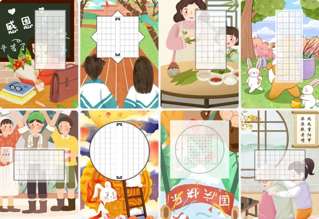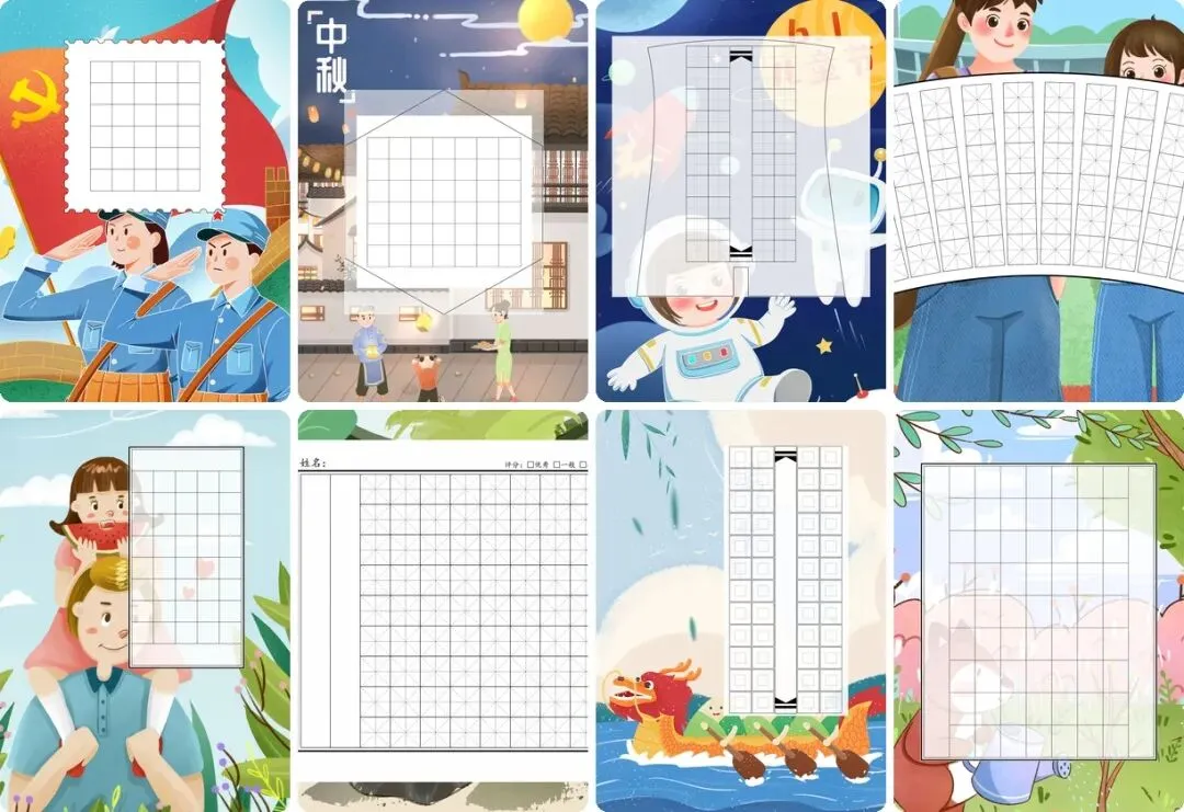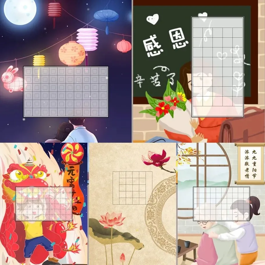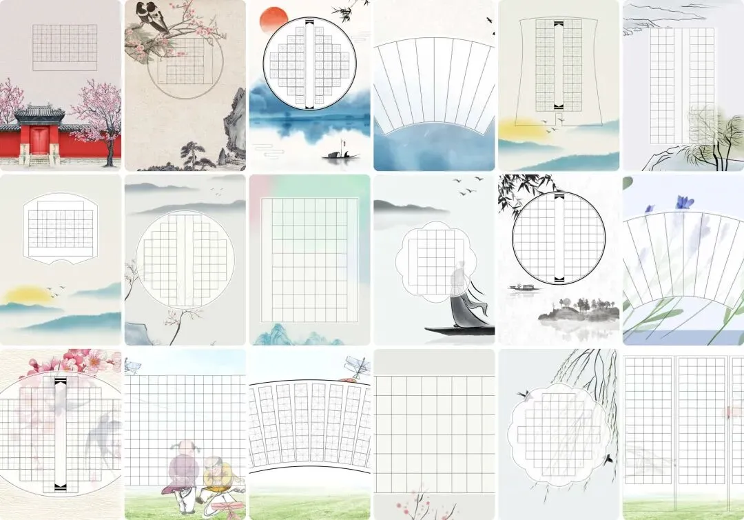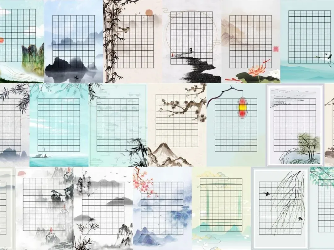 资源包含多种类型书法纸,满足不同场景需求。从田字格练字模板到诗词古诗专用纸,从比赛专用横版款式到异形创意背景,款式丰富多样。