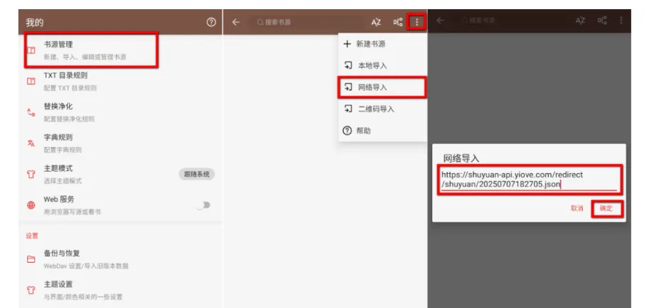 【我的】→【书源管理】→ 右上角三个点 →【网络导入】→ 输入书源链接 →【确定】