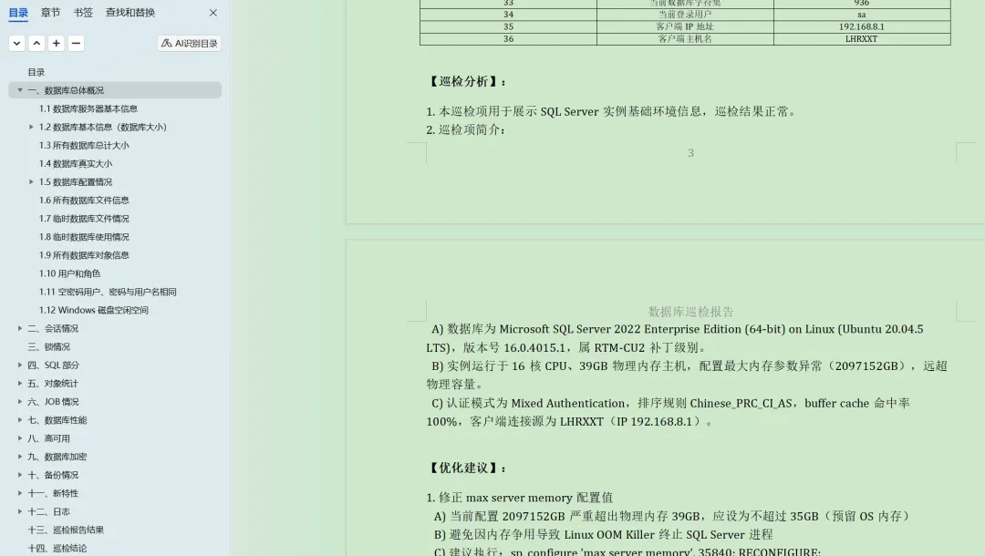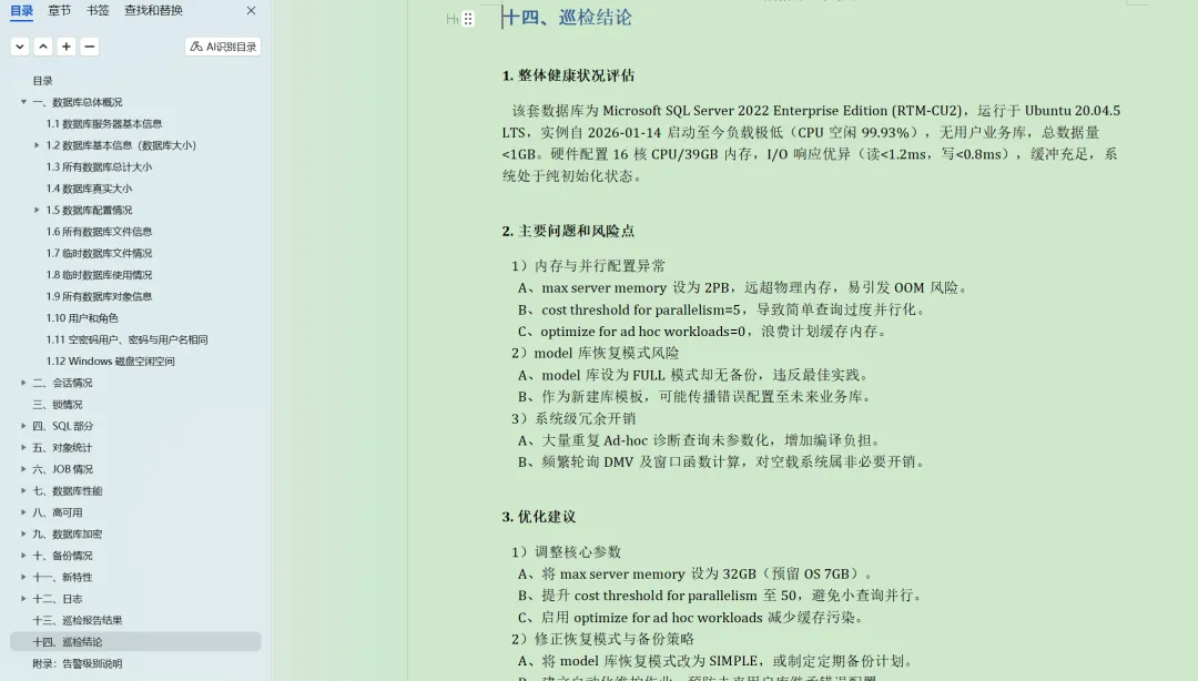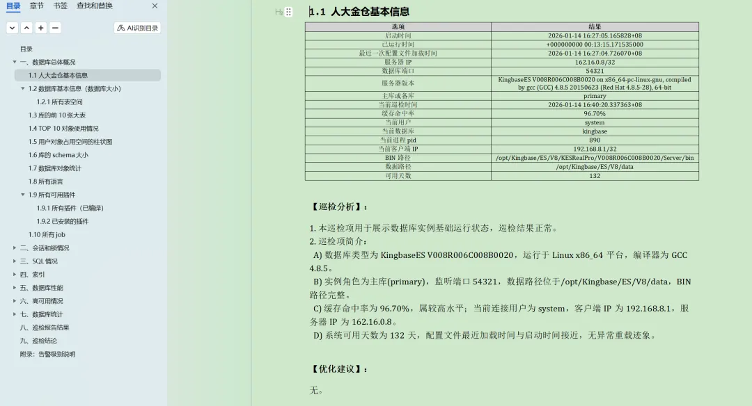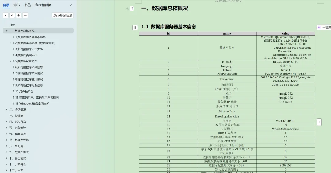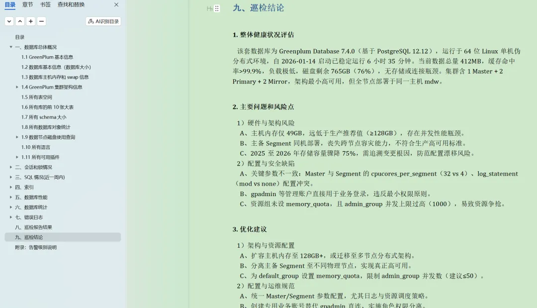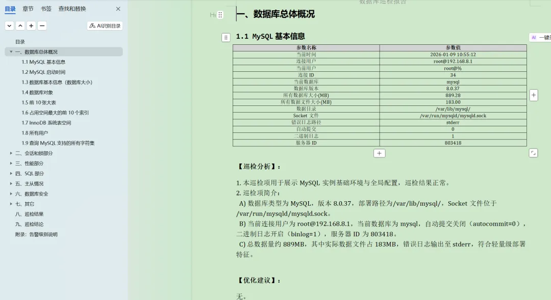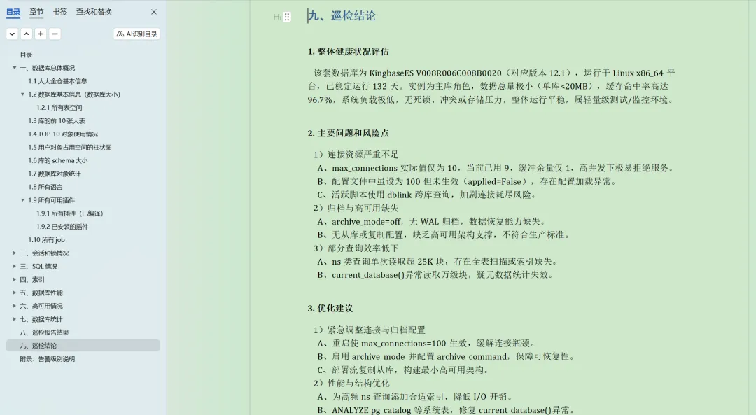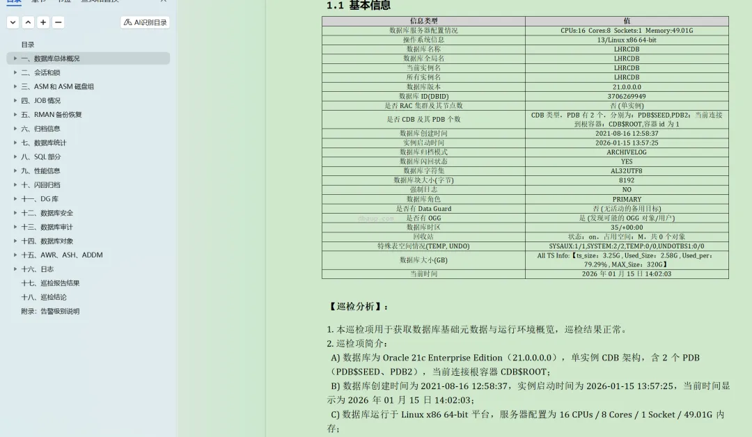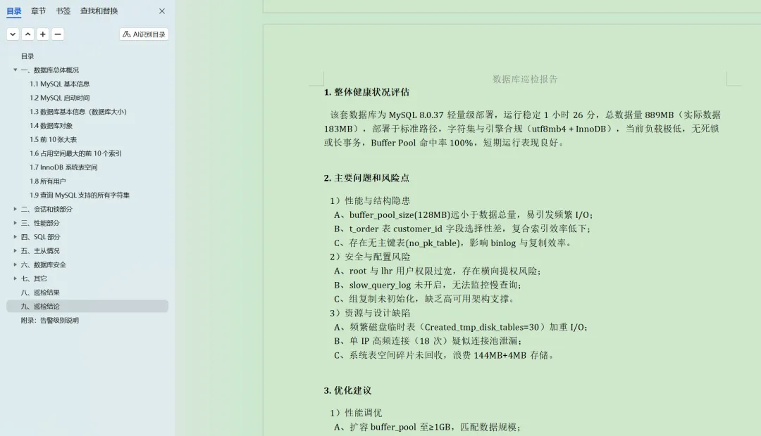 2025年花费将近半年时间,使用Python脚本编写了一个工具,可以一键直接生成word格式的报告,参考:https://www.dbaup.com/xiaomaimiaoshujukuxunjianshengchengwordgongjushuoming.html