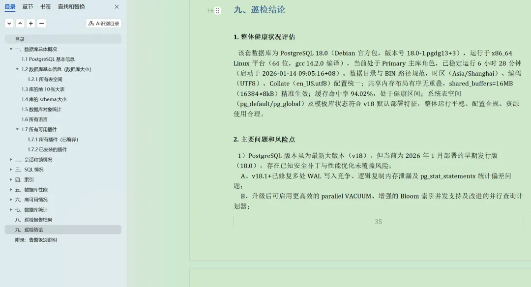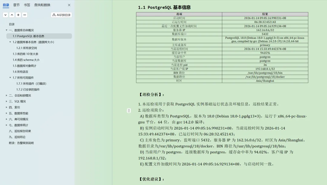 1[root@dbaup dbchecktoword]# sh start.sh 2请输入连接信息: 3types [默认: Oracle, 支持: Oracle、MySQL、SQL Server、PostgreSQL、GreenPlum、达梦、人大金仓、操作系统]: pg 4host [默认: 127.0.0.1]: 192.168.8.8 5port [默认: 5432]: 54331 6user [默认: postgres]: 7password : 8database [默认: postgres]: 9project XXX项目(可选): pg18 10 11已生成 db.conf 文件,内容如下: 12[database] 13host = 192.168.8.8 14port = 54331 15database = postgres 16user = postgres 17password = *** 18dbtypes = PostgreSQL 19project = pg18 20 21 22[2025-09-29 12:09:12] 开始执行 db_check_doc.py ... 23项目名: pg18 24类型: PostgreSQL 25读取配置文件... 26本次巡检使用的Markdown文件为: ./pg_sql.md 27连接 postgresql 数据库中... 28数据库连接成功!!! 29创建Word文档... 30 31[2025-09-29 12:09:12] 执行检查: 数据库总体概况 > PostgreSQL基本信息 32 33[2025-09-29 12:09:12] 执行检查: 数据库总体概况 > 数据库基本信息(数据库大小) 34 35[2025-09-29 12:09:12] 执行检查: 数据库总体概况 > 数据库基本信息(数据库大小) > 所有表空间 36 37[2025-09-29 12:09:12] 执行检查: 数据库总体概况 > 库的前10张大表 38 39[2025-09-29 12:09:12] 执行检查: 数据库总体概况 > 库的schema大小 40 41[2025-09-29 12:09:12] 执行检查: 数据库总体概况 > 数据库对象统计 42 43[2025-09-29 12:09:12] 执行检查: 数据库总体概况 > 所有语言 44 45[2025-09-29 12:09:12] 执行检查: 数据库总体概况 > 所有可用插件 > 所有插件(已编译) 46 47[2025-09-29 12:09:12] 执行检查: 数据库总体概况 > 所有可用插件 > 已安装的插件 48 49[2025-09-29 12:09:12] 执行检查: 会话和锁情况 > 所有会话和进程 > 总计 50 51[2025-09-29 12:09:12] 执行检查: 会话和锁情况 > 所有会话和进程 > 当前用户统计 52 53[2025-09-29 12:09:12] 执行检查: 会话和锁情况 > 所有会话和进程 > 状态统计 54 55[2025-09-29 12:09:12] 执行检查: 会话和锁情况 > 所有会话和进程 > 当前活动会话详情(只取前20) 56 57[2025-09-29 12:09:12] 执行检查: 会话和锁情况 > 空闲会话时长 > 统计 58 59[2025-09-29 12:09:12] 执行检查: 会话和锁情况 > 空闲会话时长 > 详情列表 60 61[2025-09-29 12:09:12] 执行检查: 会话和锁情况 > 锁详情 62 63[2025-09-29 12:09:12] 执行检查: SQL情况 > 总执行时间最长的SQL 64 65[2025-09-29 12:09:12] 执行检查: SQL情况 > 最耗IO的SQL 66 67[2025-09-29 12:09:12] 执行检查: SQL情况 > 最耗共享内存 SQL 68 69[2025-09-29 12:09:12] 执行检查: 索引 > 从未使用过的索引统计 70 71[2025-09-29 12:09:12] 执行检查: 索引 > 占用空间最大的几个索引 72 73[2025-09-29 12:09:12] 执行检查: 索引 > 缺失主键索引的表 74 75[2025-09-29 12:09:12] 执行检查: 数据库性能 > 基本参数 > 基本参数 76 77[2025-09-29 12:09:12] 执行检查: 数据库性能 > 基本参数 > 哪些参数被修改过 78 79[2025-09-29 12:09:12] 执行检查: 数据库性能 > 基本参数 > pg_hba.conf配置文件信息(PG10) 80 81[2025-09-29 12:09:12] 执行检查: 数据库性能 > 基本参数 > 参数文件记录的参数 82 83[2025-09-29 12:09:12] 执行检查: 数据库性能 > 基本参数 > 获取已安装的PostgreSQL的信息 84 85[2025-09-29 12:09:12] 执行检查: 数据库性能 > 基本参数 > 用户认证方式(PG16) 86 87[2025-09-29 12:09:12] 执行检查: 数据库性能 > 所有库表膨胀信息 88 89[2025-09-29 12:09:12] 执行检查: 数据库性能 > 所有库表膨胀信息 > 按数据库汇总统计膨胀的表 90 91[2025-09-29 12:09:12] 执行检查: 数据库性能 > 所有库缺失统计信息的表(只列举100条) 92 93[2025-09-29 12:09:12] 执行检查: 数据库性能 > 所有库缺失统计信息的表(只列举100条) > 按数据库汇总统计缺失统计信息的表 94 95[2025-09-29 12:09:12] 执行检查: 数据库性能 > 缓存命中率和事务提交率 96 97[2025-09-29 12:09:12] 执行检查: 数据库性能 > WAL日志切换频率(可能需要手工指定归档日志的位置) 98 99[2025-09-29 12:09:12] 执行检查: 数据库性能 > 用户100101[2025-09-29 12:09:12] 执行检查: 高可用情况 > 主从流复制情况 > 主库查看wal日志发送状态102103[2025-09-29 12:09:12] 执行检查: 高可用情况 > 主从流复制情况 > 从库查看wal日志接收状态104105[2025-09-29 12:09:12] 执行检查: 高可用情况 > 主从流复制情况 > 主从库延迟数据(单位MB)106107[2025-09-29 12:09:12] 执行检查: 高可用情况 > 主从流复制情况 > 主从流复制冲突统计108109[2025-09-29 12:09:12] 执行检查: 高可用情况 > 逻辑复制 > 查看发布110111[2025-09-29 12:09:12] 执行检查: 高可用情况 > 逻辑复制 > 查看发布的表112113[2025-09-29 12:09:12] 执行检查: 高可用情况 > 逻辑复制 > 查看所有的订阅者114115[2025-09-29 12:09:12] 执行检查: 高可用情况 > 逻辑复制 > 复制进度116117[2025-09-29 12:09:12] 执行检查: 高可用情况 > 逻辑复制 > 查看订阅118119[2025-09-29 12:09:12] 执行检查: 高可用情况 > 逻辑复制 > 查看订阅的表120121[2025-09-29 12:09:12] 执行检查: 高可用情况 > 逻辑复制 > 查看复制槽122123[2025-09-29 12:09:12] 执行检查: 数据库统计 > 后台写进程统计信息124125[2025-09-29 12:09:12] 执行检查: 数据库统计 > wal日志统计(PG14)126127[2025-09-29 12:09:12] 执行检查: 数据库统计 > 统计软硬解析次数128129[2025-09-29 12:09:12] 执行检查: 数据库统计 > 数据库统计详情(含坏块等)130131[2025-09-29 12:09:12] 执行检查: 数据库统计 > 数据库IO详情(PG16新增)132133[2025-09-29 12:09:12] 执行检查: 数据库统计 > 复制槽活动信息(pg14)134135[2025-09-29 12:09:12] 执行检查: 数据库统计 > copy进度(pg14)136137[2025-09-29 12:09:12] 执行检查: 数据库统计 > 显示访问cached pages的统计信息(PG 13)1