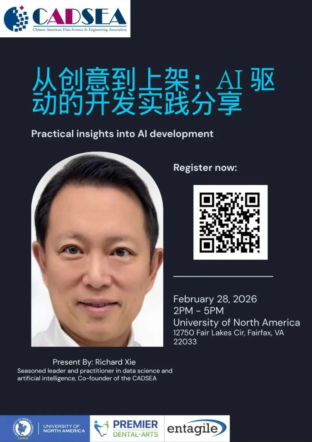各位 CADSEA 的朋友们,我们诚挚邀请您参加 CADSEA 即将举办的线下主题分享活动:CADSEA × Richard Xie AI 从创意到 App Store 的实践分享📅 时间:2 月 28 日(周六) 2:00–5:00 PM 📍 地点:北美大学(University of North America)12750 Fair Lakes Cir, Fairfax, VA 22033📌 形式:主题分享 + 互动问答 本次活动我们特别邀请 Richard Xie —— CADSEA 联合创始人、数据科学与人工智能领域的资深技术领导者与教育者。Richard 将结合其 AI 产品 V-Rise 的实际开发与上架经验,分享 AI 驱动的产品实践如何影响教育、职业发展与创新创业。本次分享将围绕以下内容展开:– AI 产品从想法到上线的完整路径 – AI 对学习方式与教育模式的影响 – AI 时代的职业发展与能力构建 – 创新与创业实践中的真实经验 – 基于真实产品的案例分享 活动将包含互动问答环节,欢迎大家参与交流。报名链接: https://forms.gle/PzNrT4rJWc1gCumX7如有兴趣,您也可以提前体验 Richard 的 AI 应用 V-Rise,并在活动中分享您的使用感受与反馈。名额有限,欢迎尽早报名。期待与您线下相见!