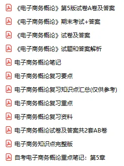 今天分享的资料是「0153-电子商务概论」电子版+学习笔记+知识点总结+期末考试重点+复习资料+习题集及答案+名词解释+历年真题试卷及答案+题库及答案+复习重点+思考题及参考答案+公式总结+考试重点基础题+知识总结+高清PDF可打印+免费分享!