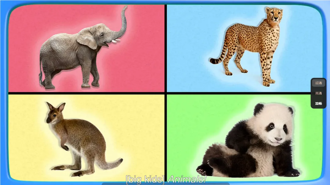 《Word Party》是一部面向低龄宝宝的动画片,通过片中4个可爱的小动物(小象、豹子、袋鼠、熊猫),帮助孩子了解一些简单的单词和对话,并且动画中传递了社交和适合宝宝理解的价值观,如:友爱、分享和互助等。