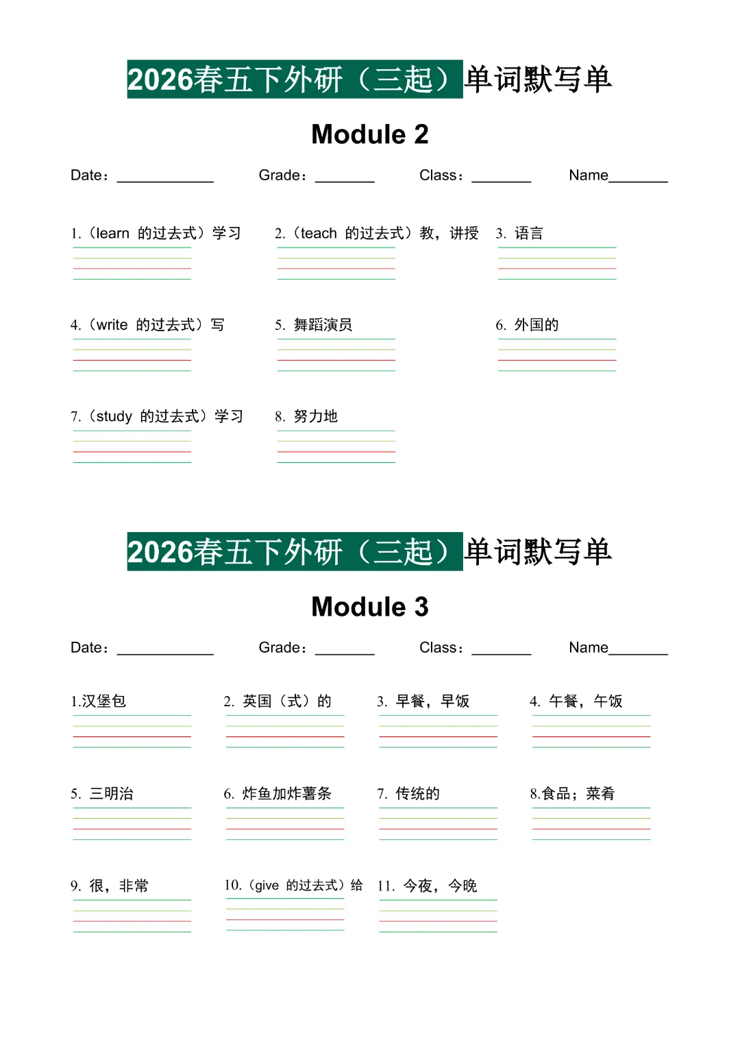 【五年级下册英语外研版三起】M1-M10单词默写单丨完整高清可打印