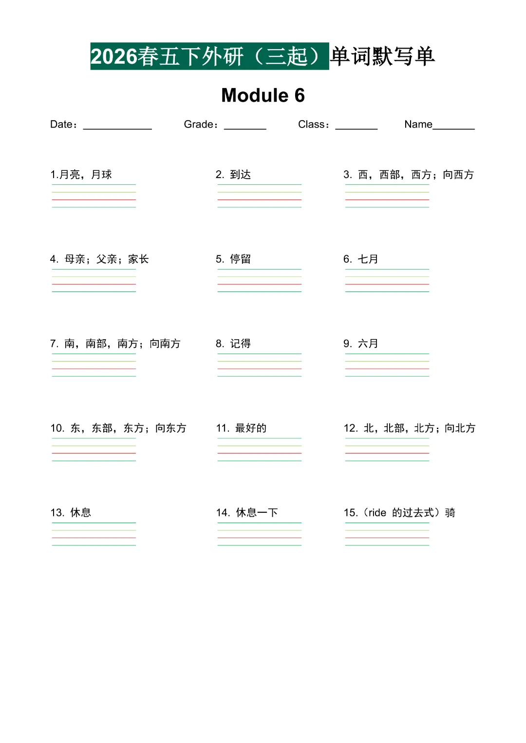 今天给大家分享的是:【五年级下册英语外研版三起】M1-M10单词默写单丨完整高清电子版可打印