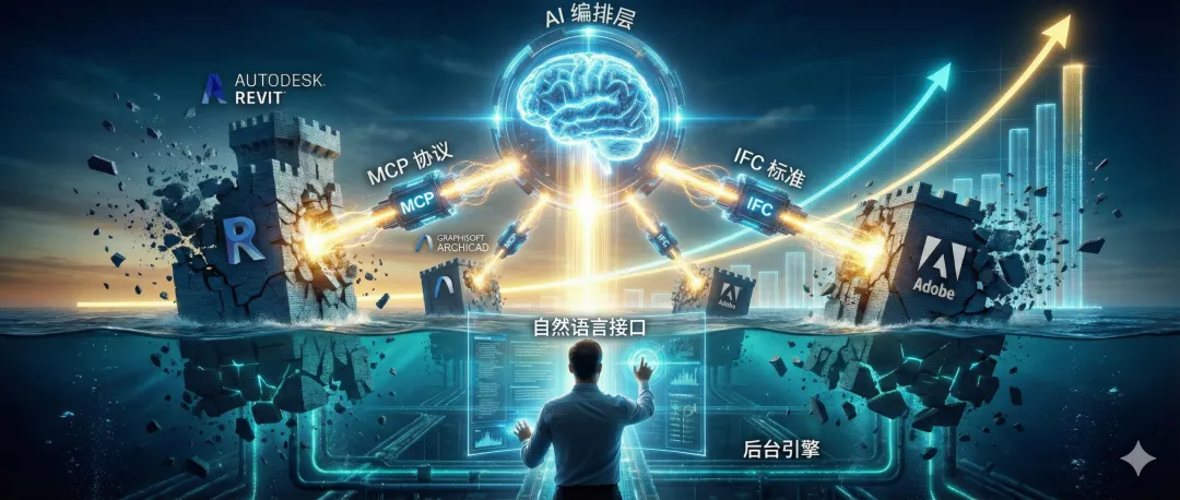 功能壁垒: MCP(模型上下文协议)被称为”AI 应用的 USB-C 接口”,允许 AI 代理同时调用十几个软件的功能碎片,实时重组为一条动态工作流。建筑模型从 Revit 来、承重数据从结构分析工具来、几何校验由 IfcOpenShell 负责——过去需要购买专门插件才能完成的跨软件任务,现在 AI 直接编排。