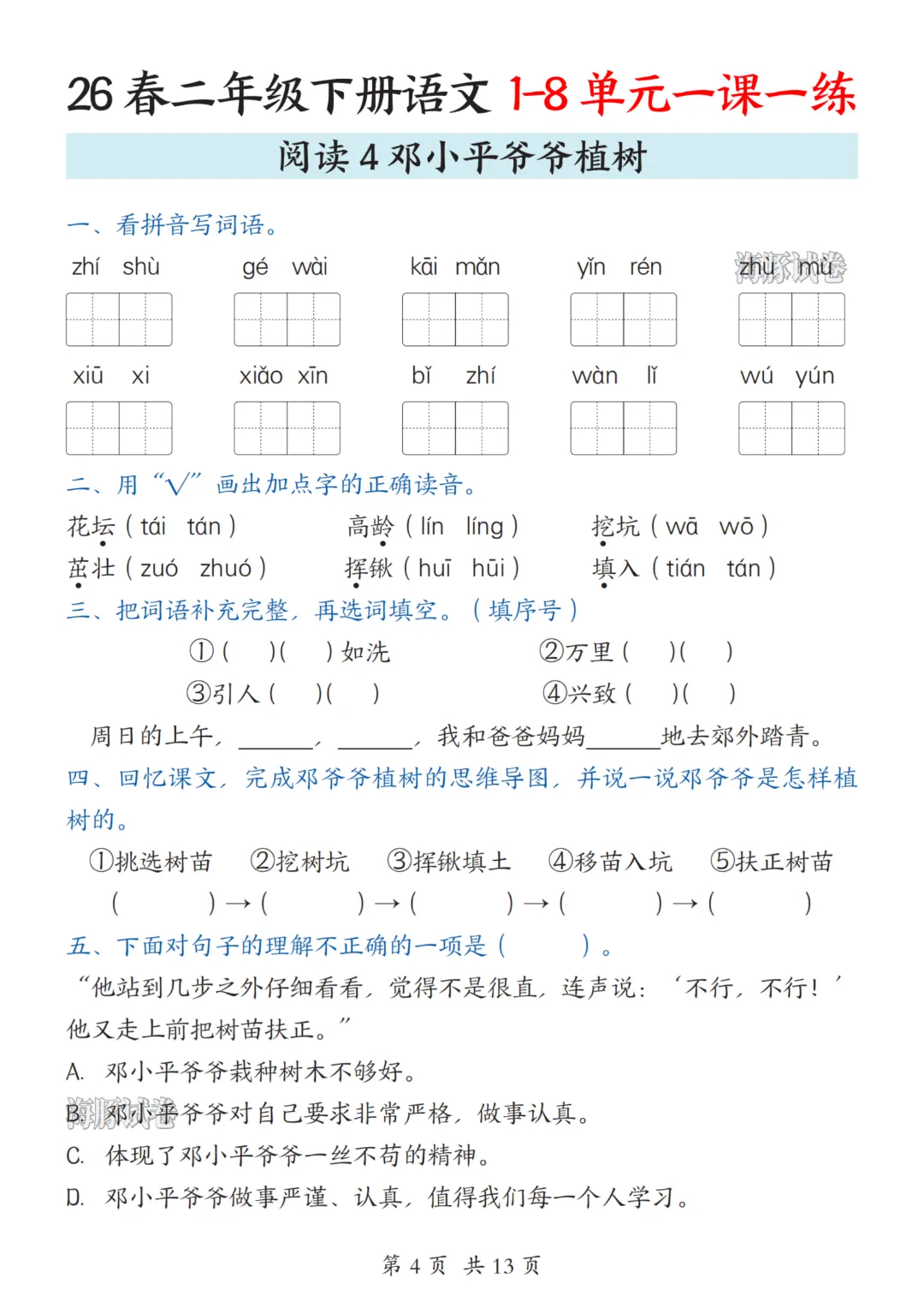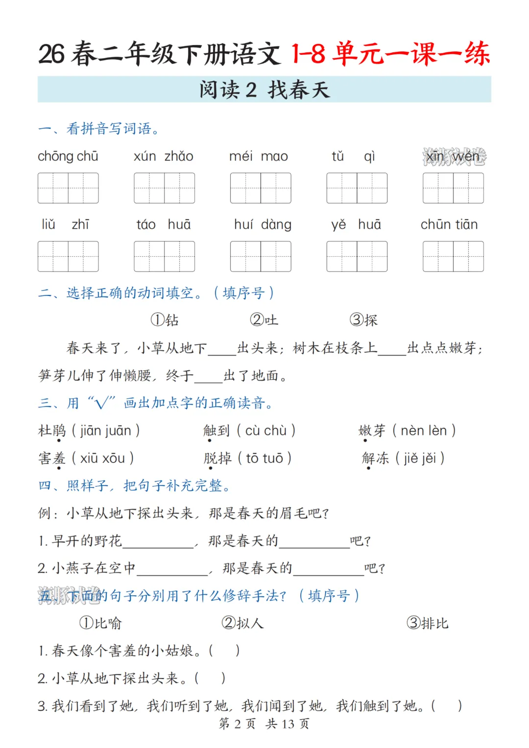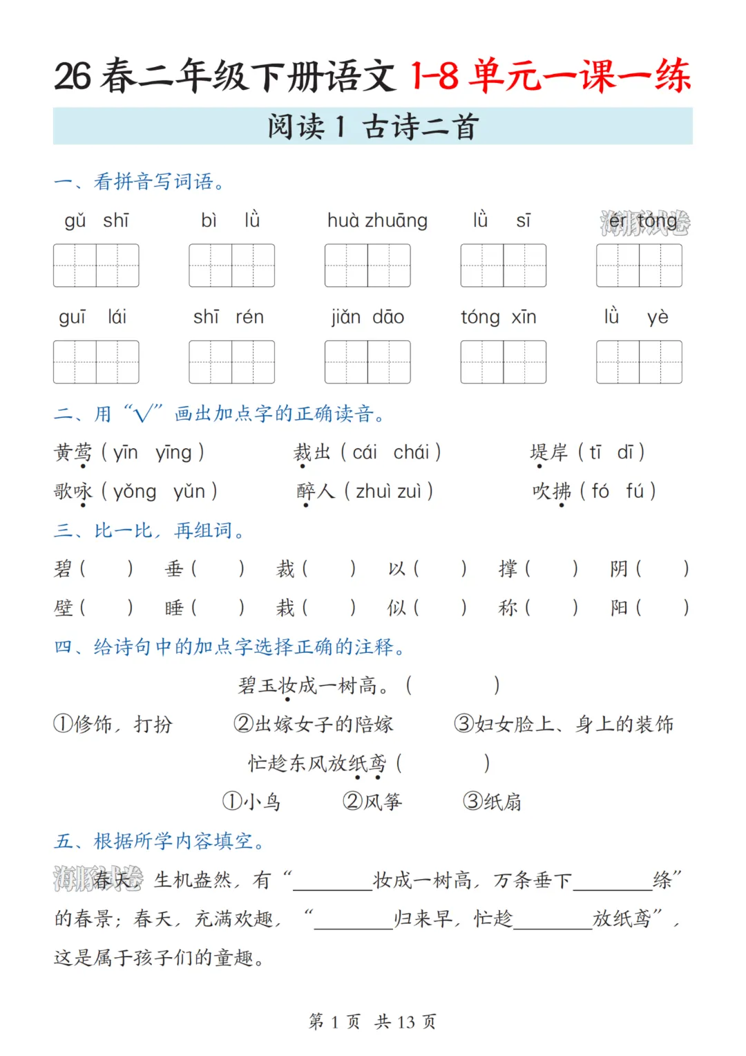 二年级下册语文人教部编版【第1-8单元一课一练】| 完整高清可打印