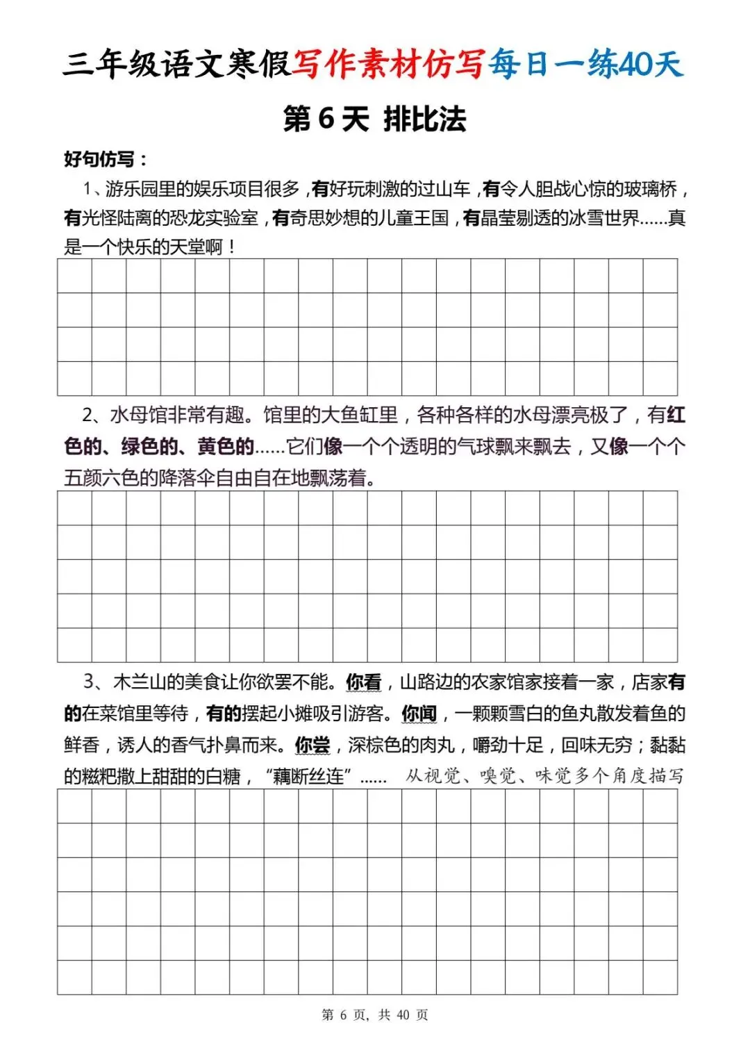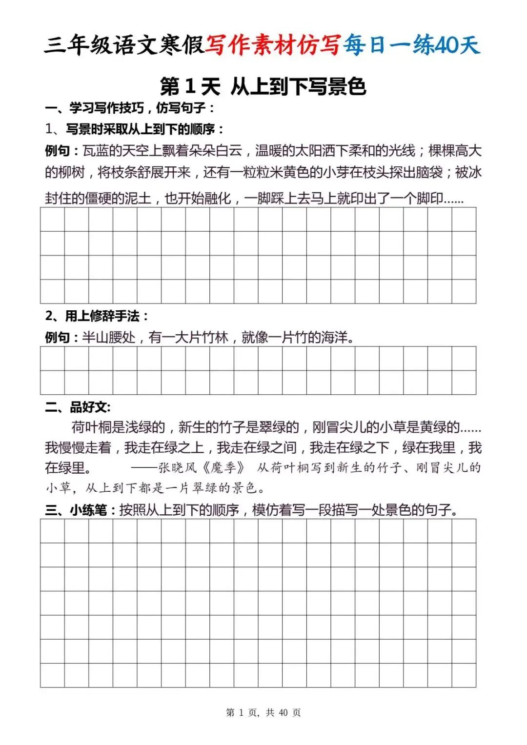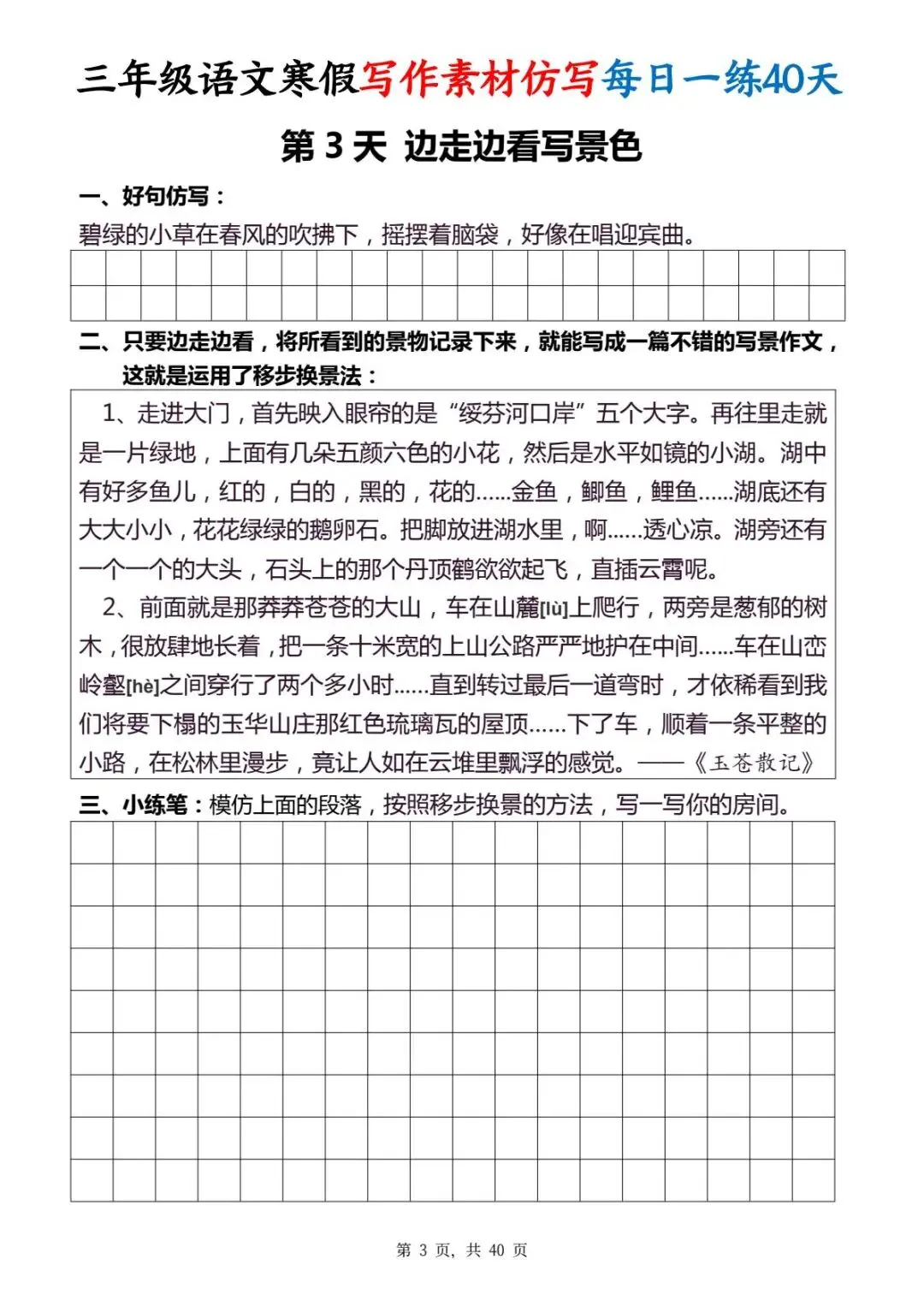 今天给大家分享的是:三年级(下)写作素材仿写每日一练,共40页,电子版可下载打印。文章末尾可直接领取全套电子版,无套路,欢迎收藏和下载。如果觉得这份资料不错,建议分享到班级群/年级群,让其他家长打印出来,帮助孩子学习;如果觉得合适,请支持正版!