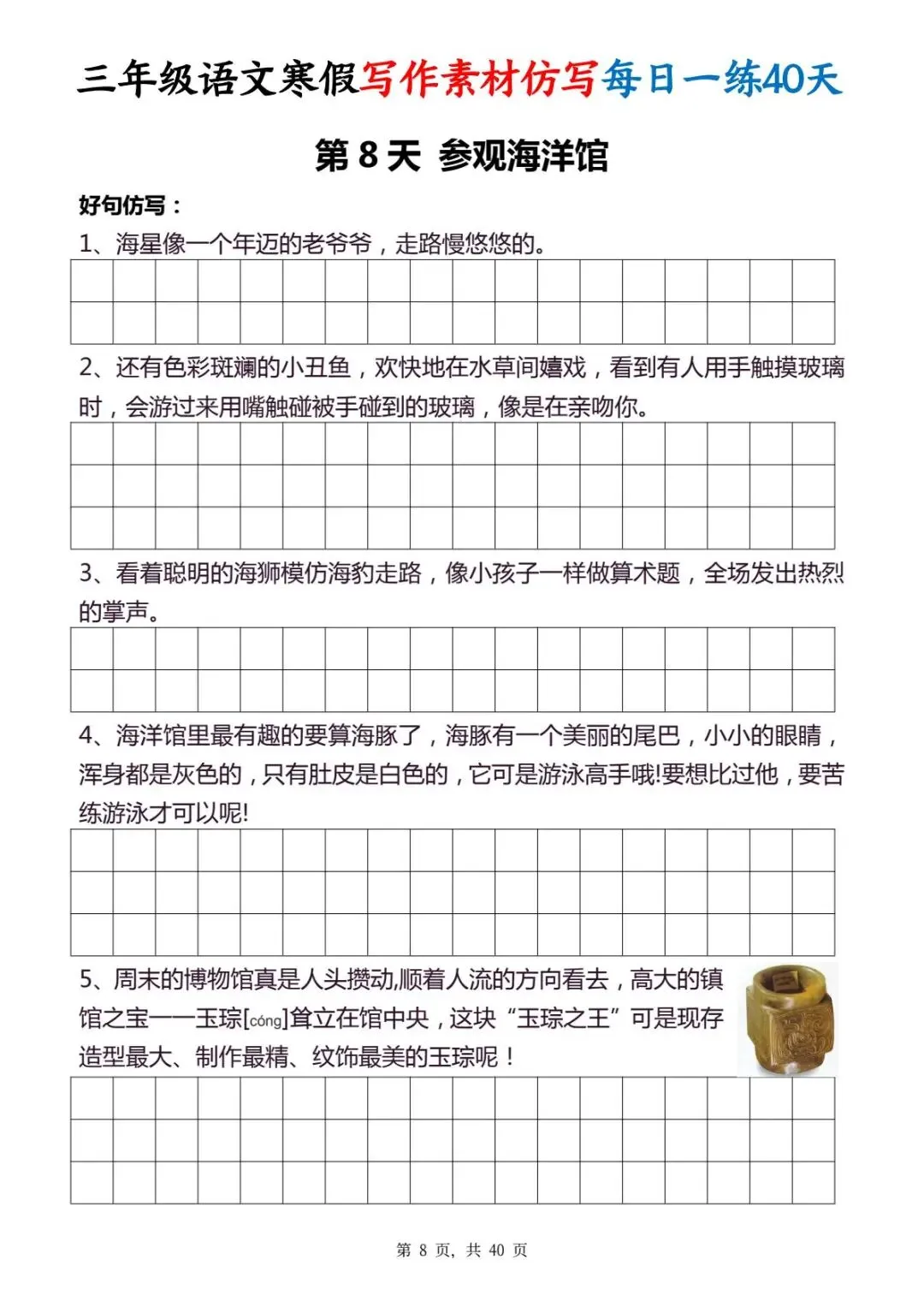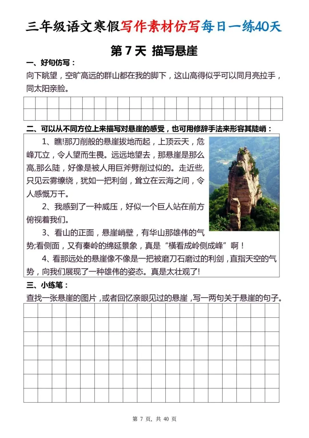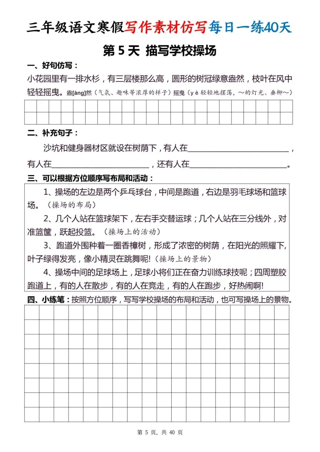 今天给大家分享的是:三年级(下)写作素材仿写每日一练,共40页,电子版可下载打印。文章末尾可直接领取全套电子版,无套路,欢迎收藏和下载。如果觉得这份资料不错,建议分享到班级群/年级群,让其他家长打印出来,帮助孩子学习;如果觉得合适,请支持正版!