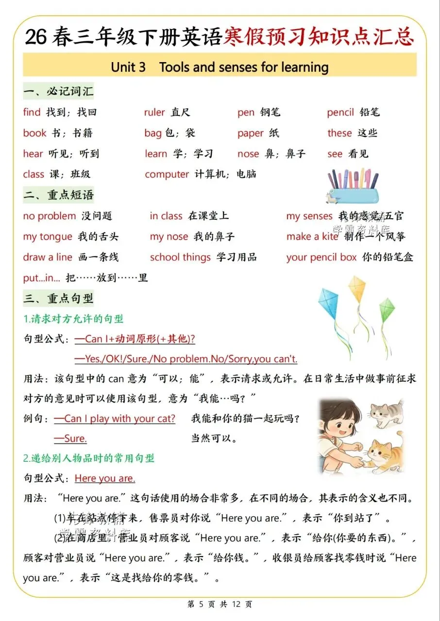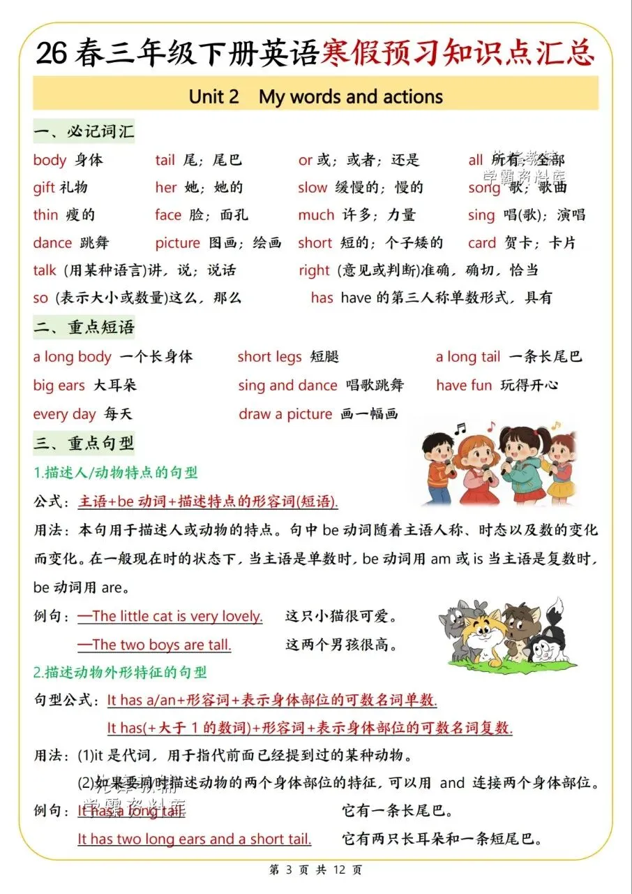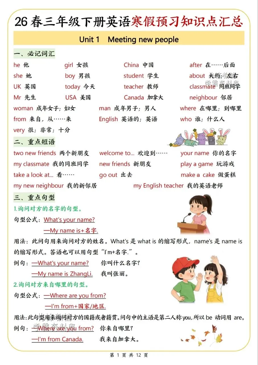 这份资料适配人教版教材,按单元梳理词汇、短语、句型与语法,搭配实用例句与发音指导,覆盖日常交流、生活场景等内容,逻辑清晰、重点突出,兼顾基础巩固与应用拓展。