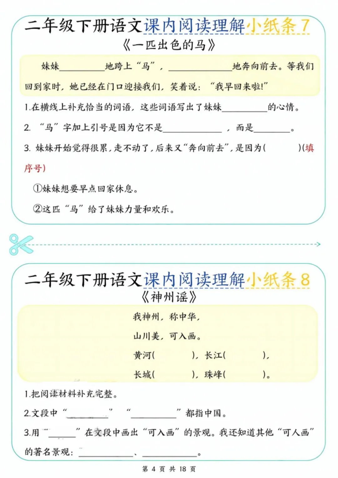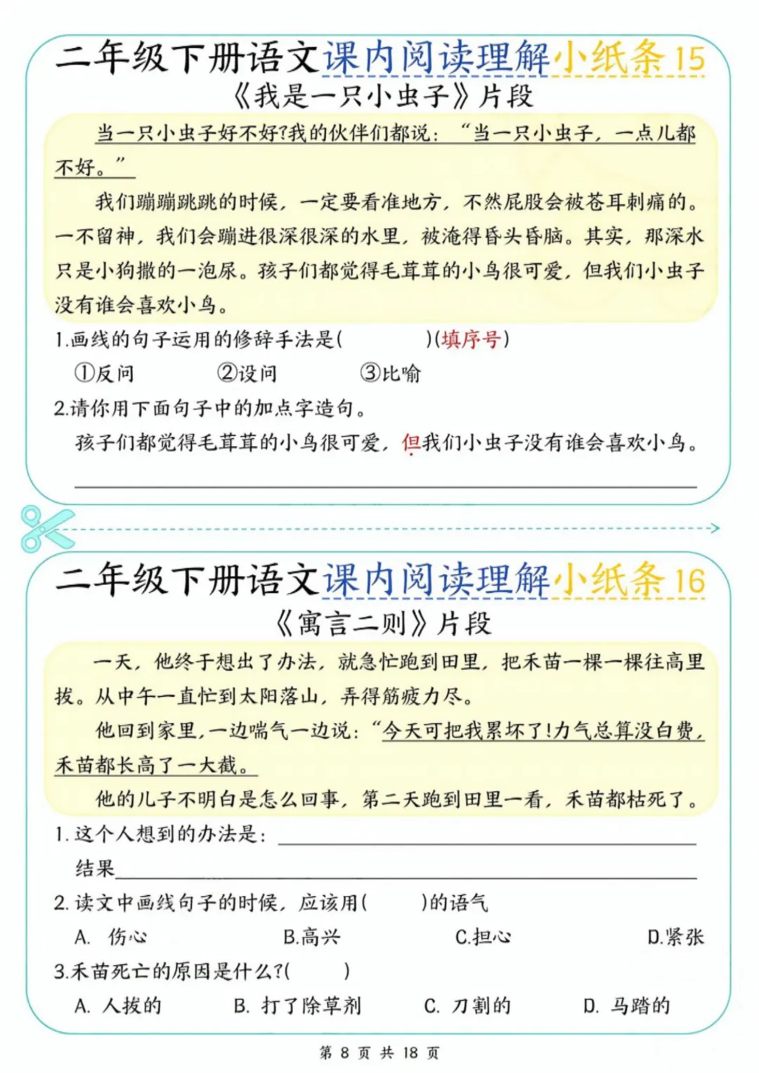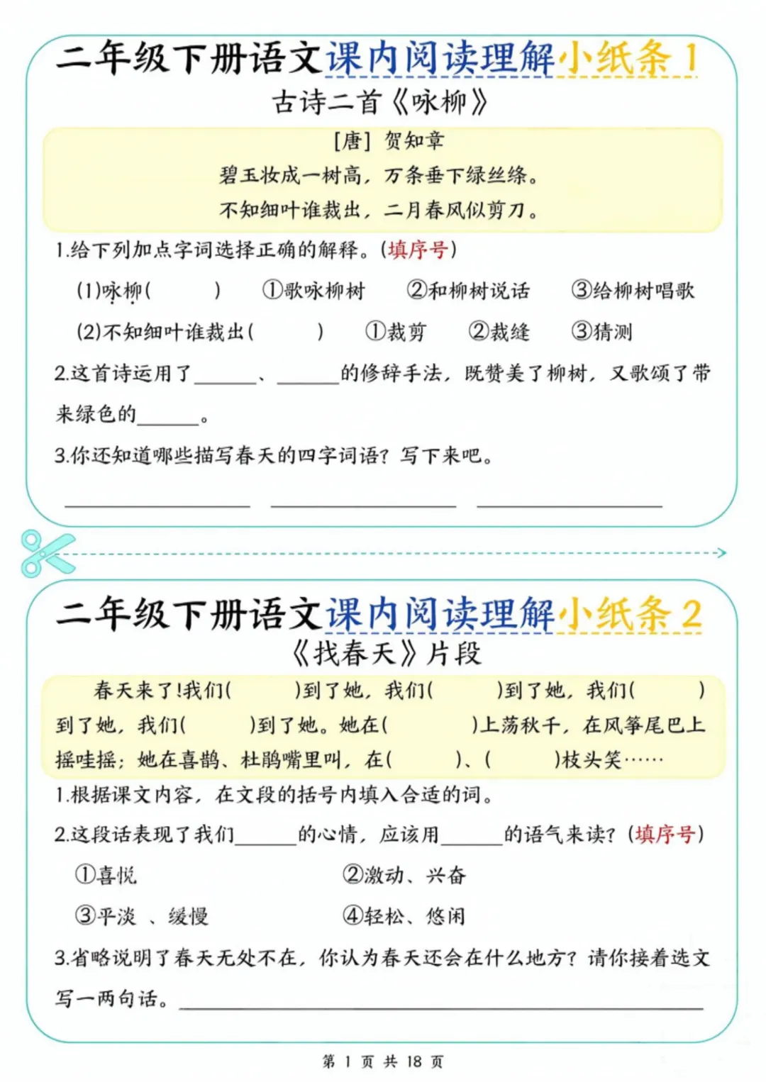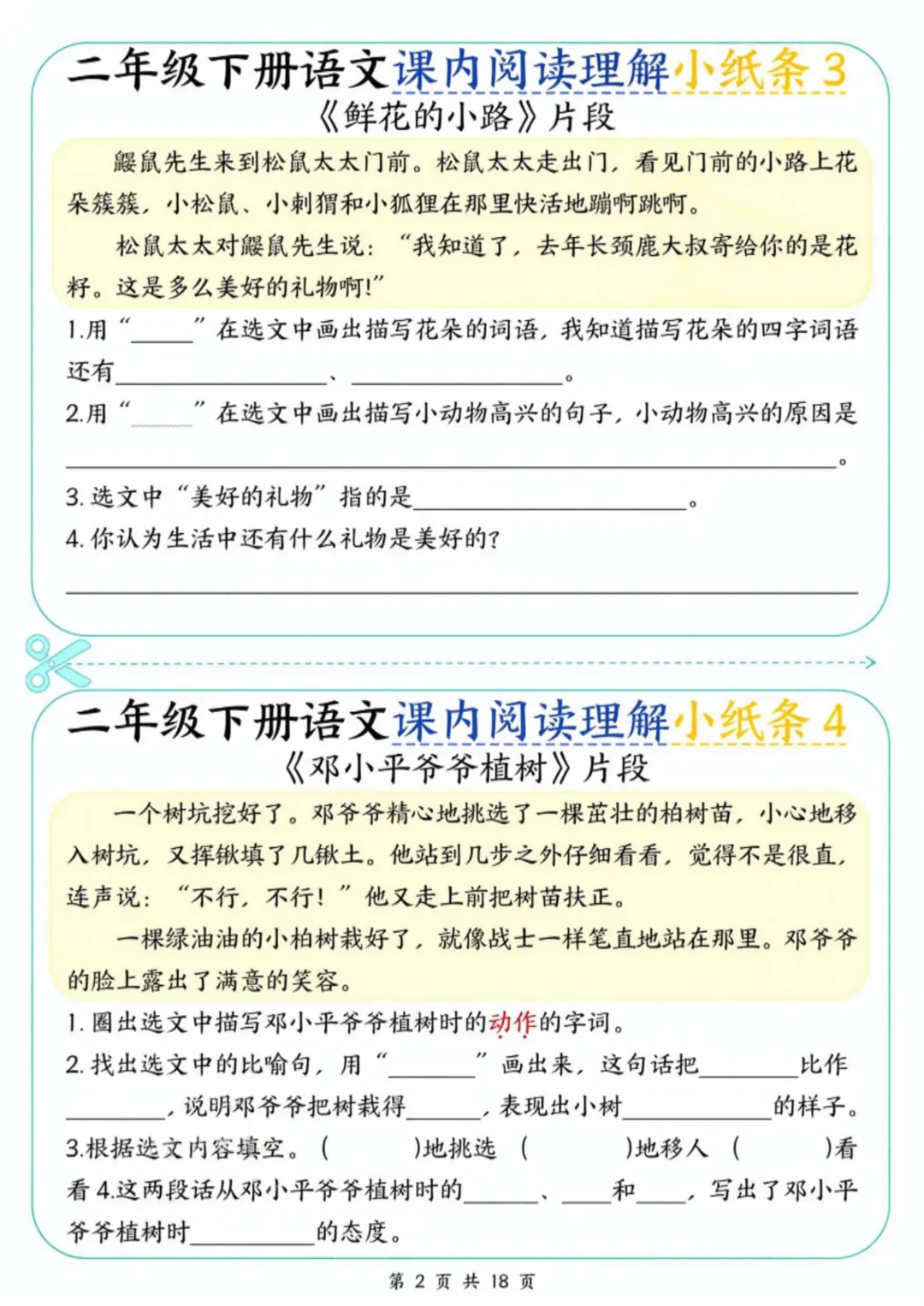 这份二年级下册语文课内阅读理解小纸条,紧扣课本重点篇目,通过字词释义、修辞分析、课文填空、仿写拓展等多种题型,帮助孩子夯实课内基础,提升阅读理解与语言表达能力,是课后巩固、单元复习的高效好帮手。