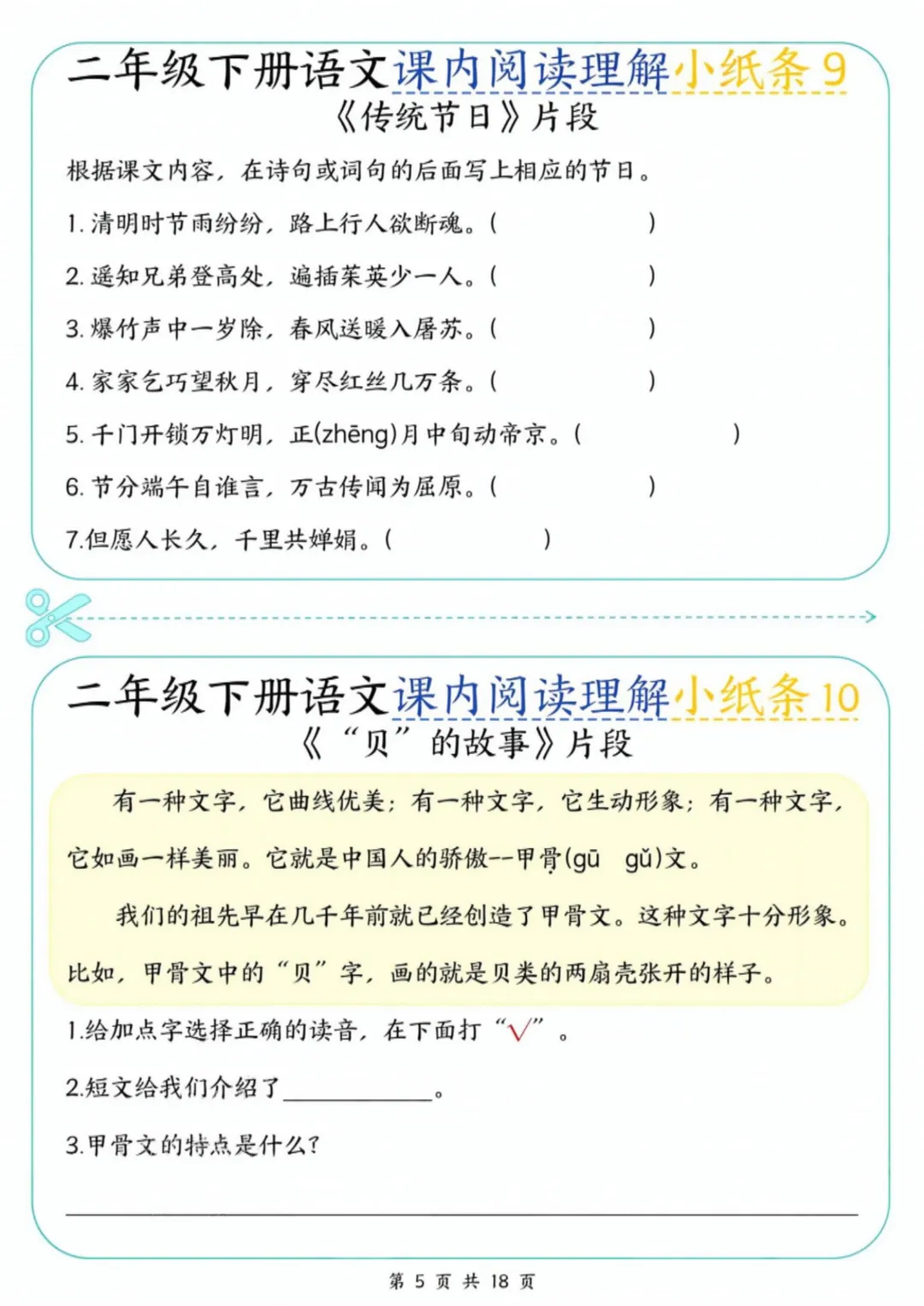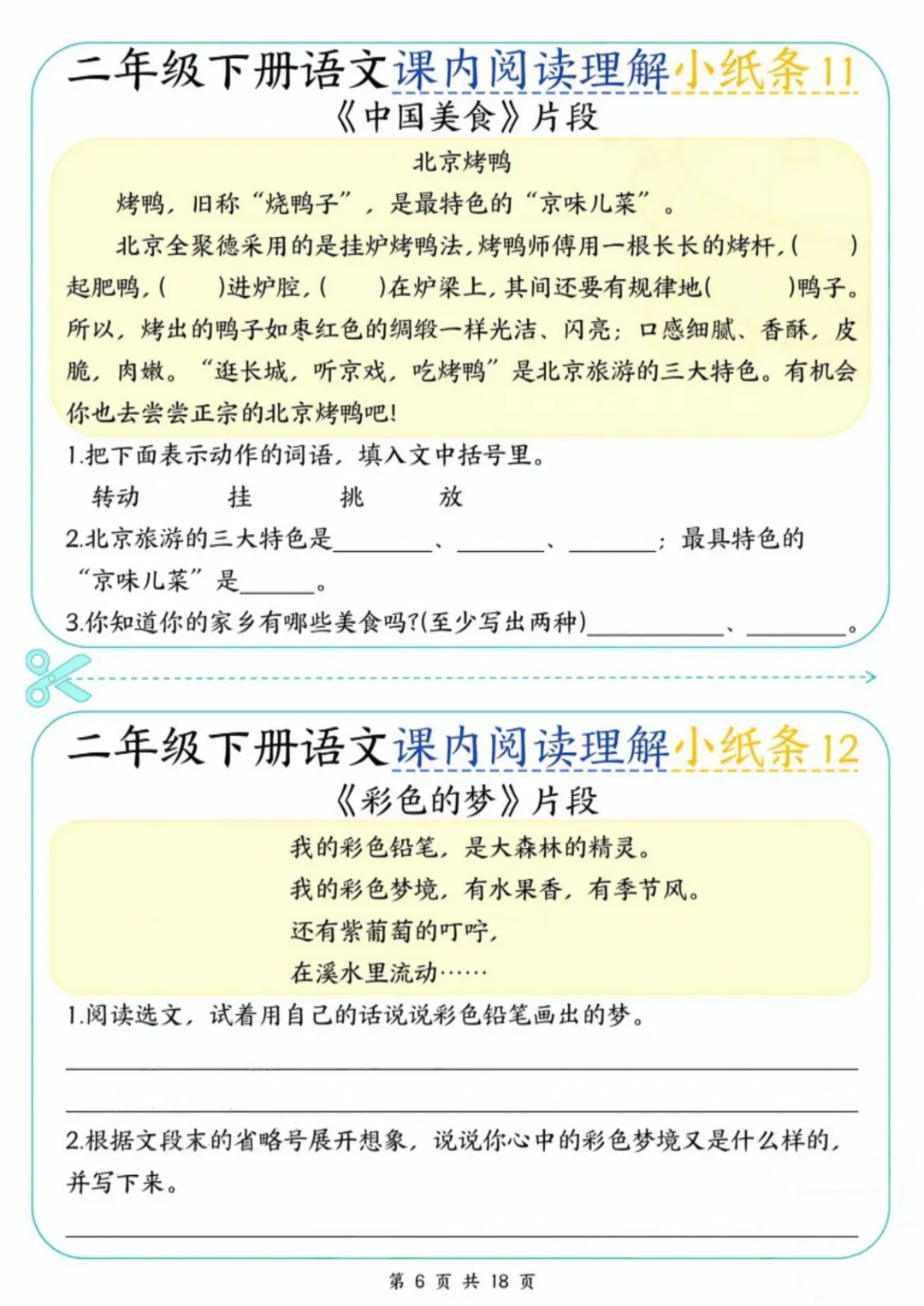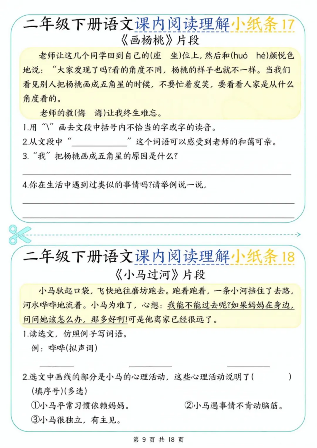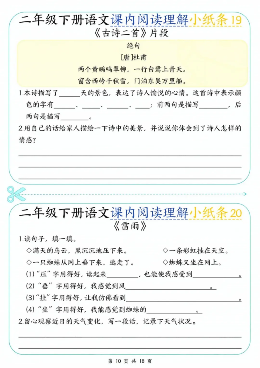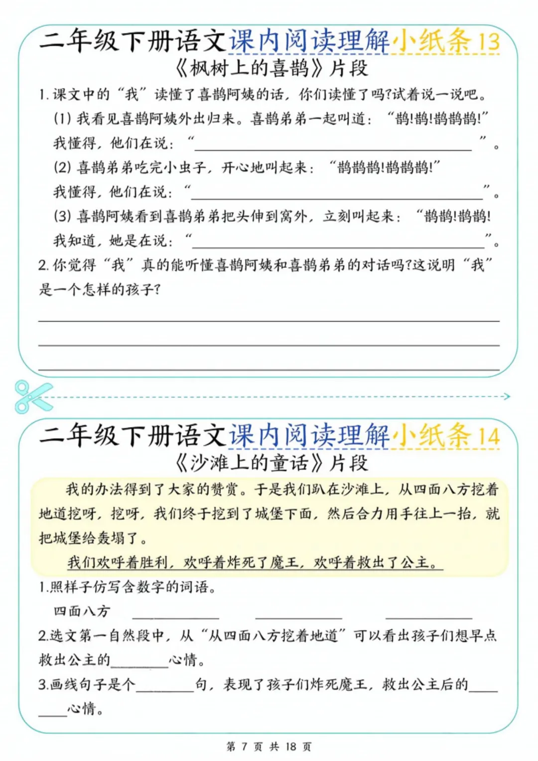 这份二年级下册语文课内阅读理解小纸条,紧扣课本重点篇目,通过字词释义、修辞分析、课文填空、仿写拓展等多种题型,帮助孩子夯实课内基础,提升阅读理解与语言表达能力,是课后巩固、单元复习的高效好帮手。