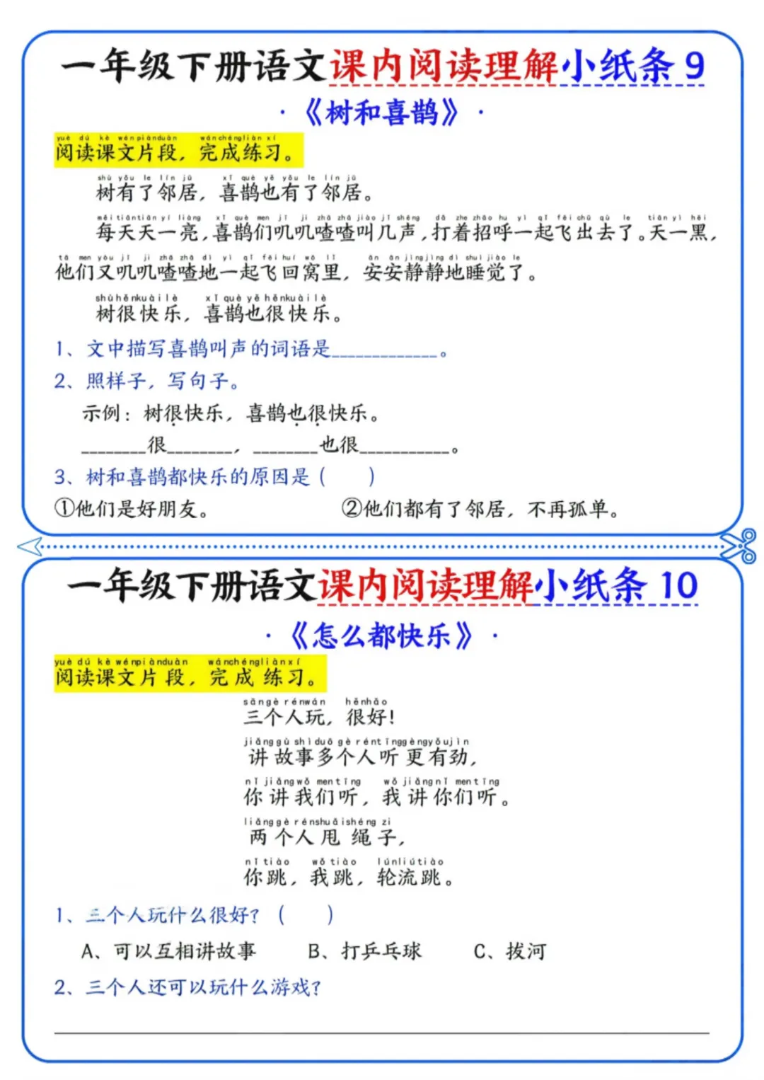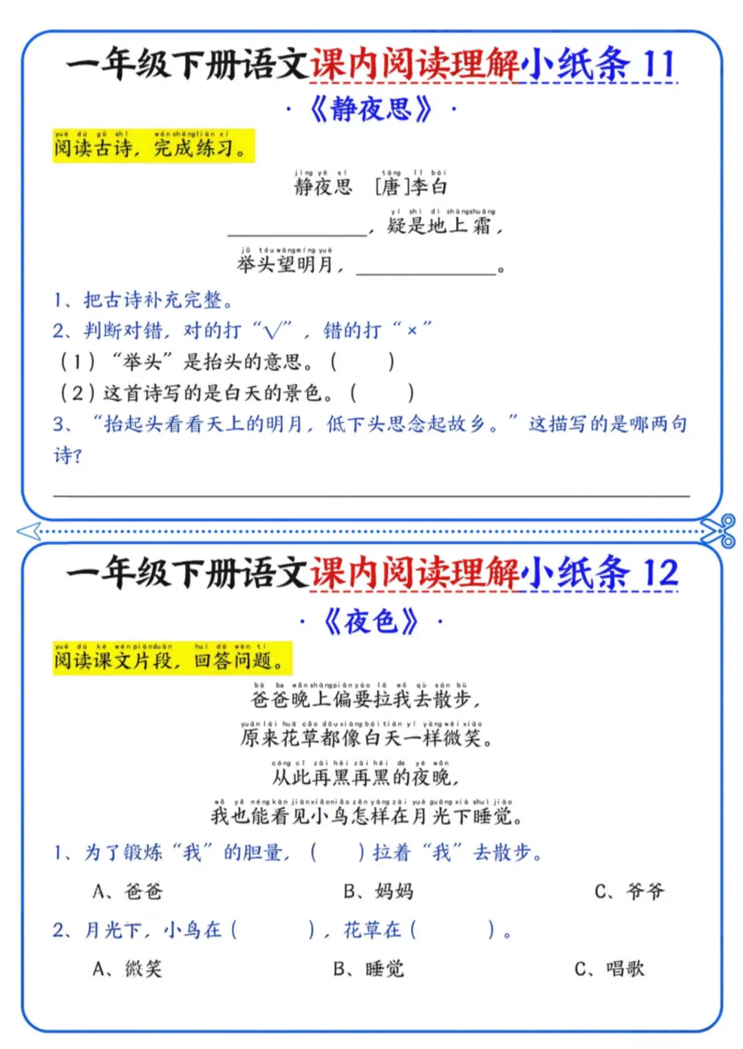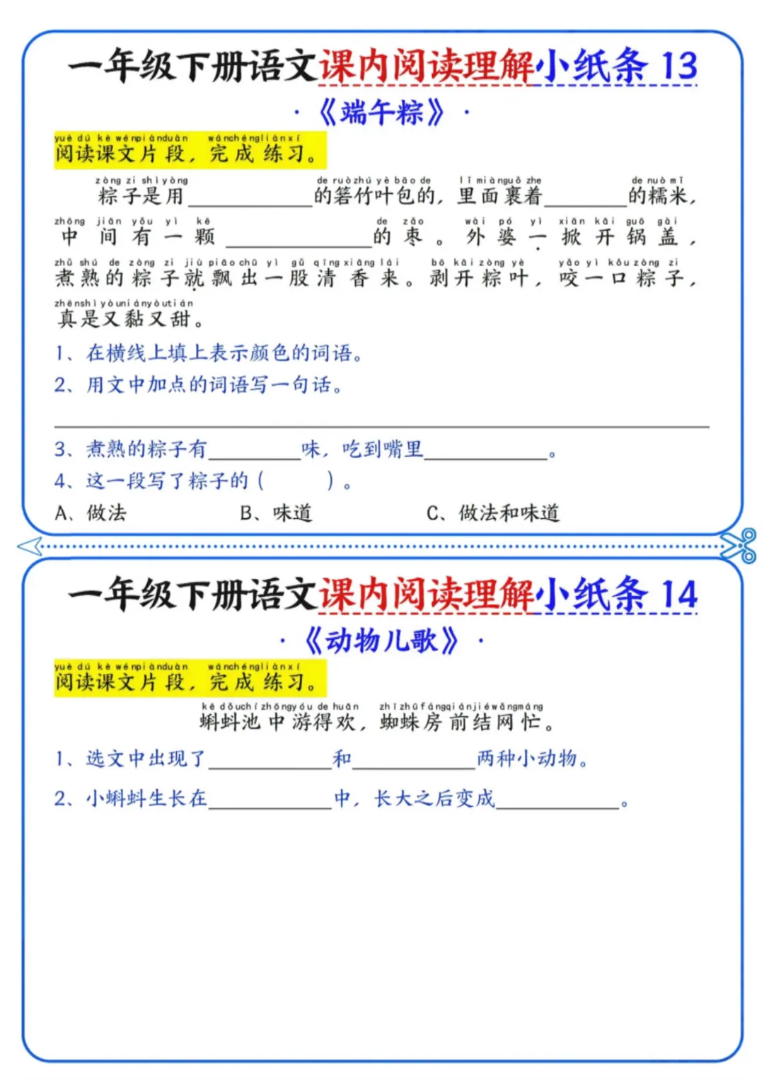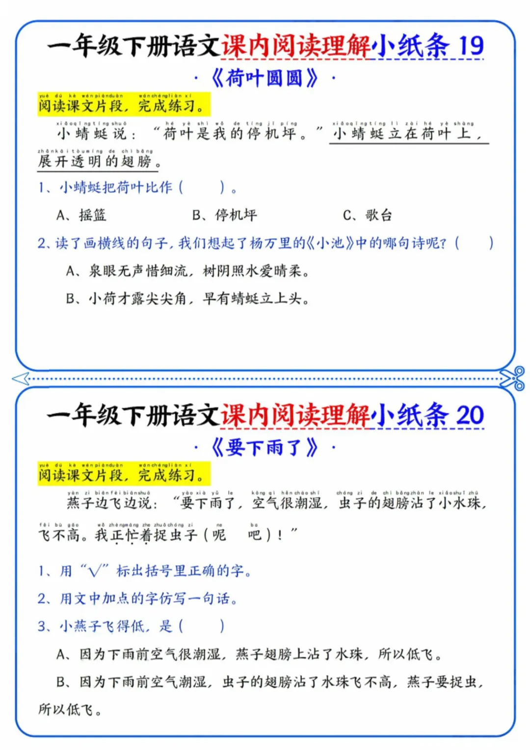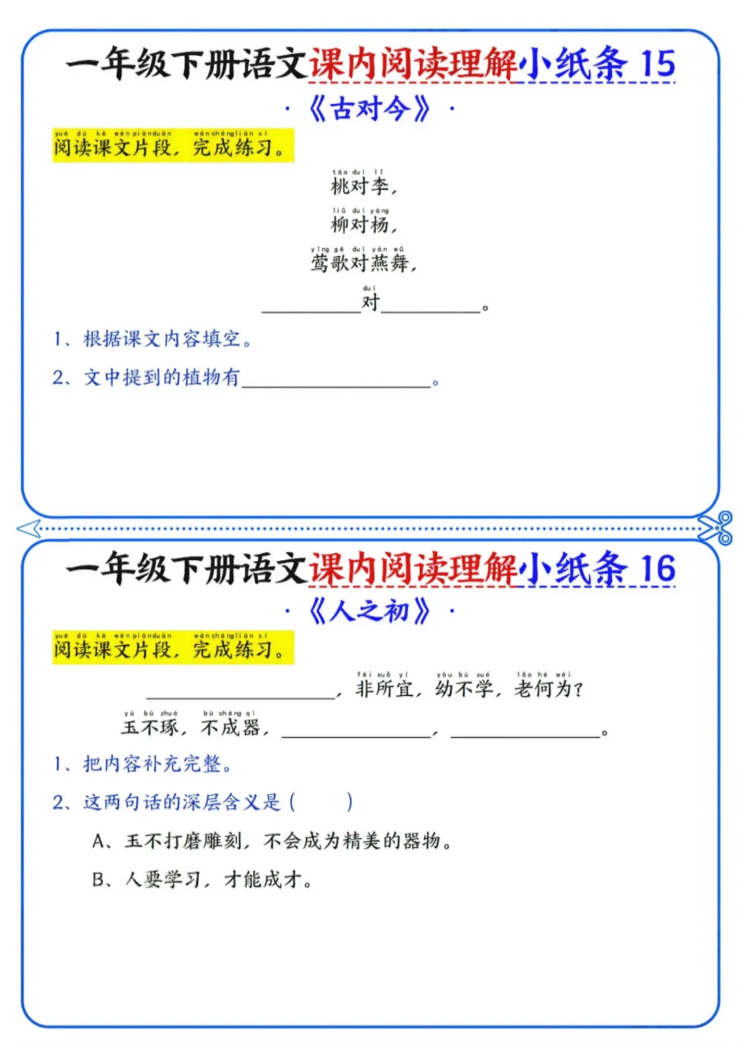 《一年级下册语文内阅读理解小纸条》电子版可打印