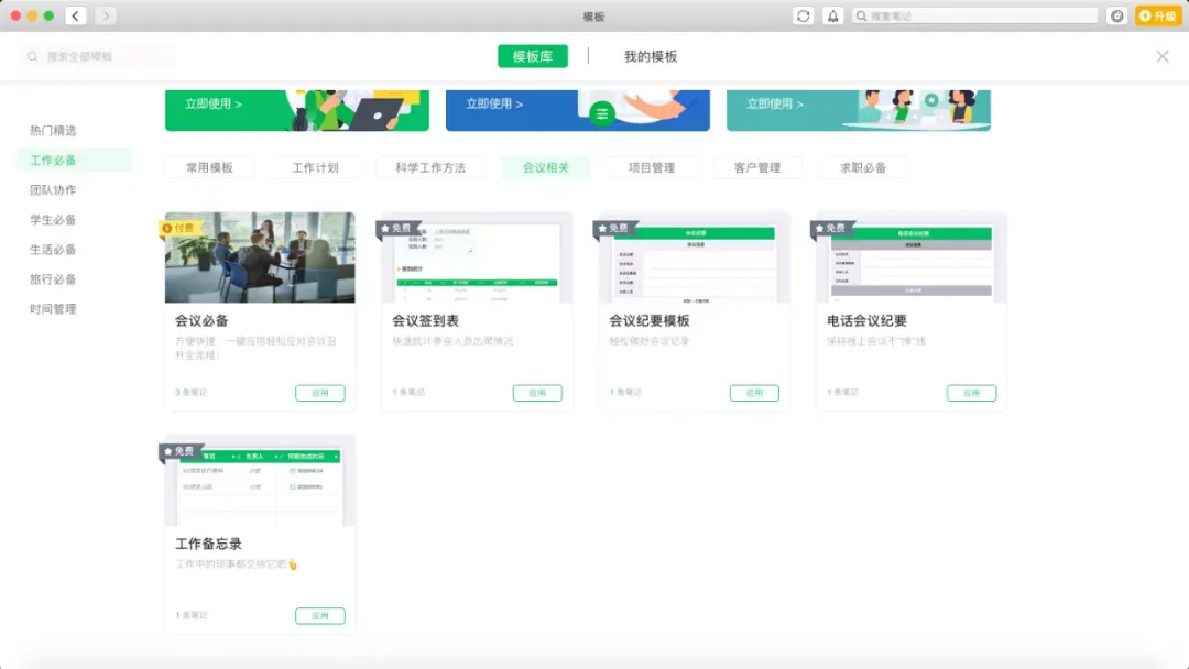 这是印象笔记的一个杀器。比如我们想做一个会议纪要,不知道该怎么组织内容,那可以在模板库里找到参考,然后直接使用。