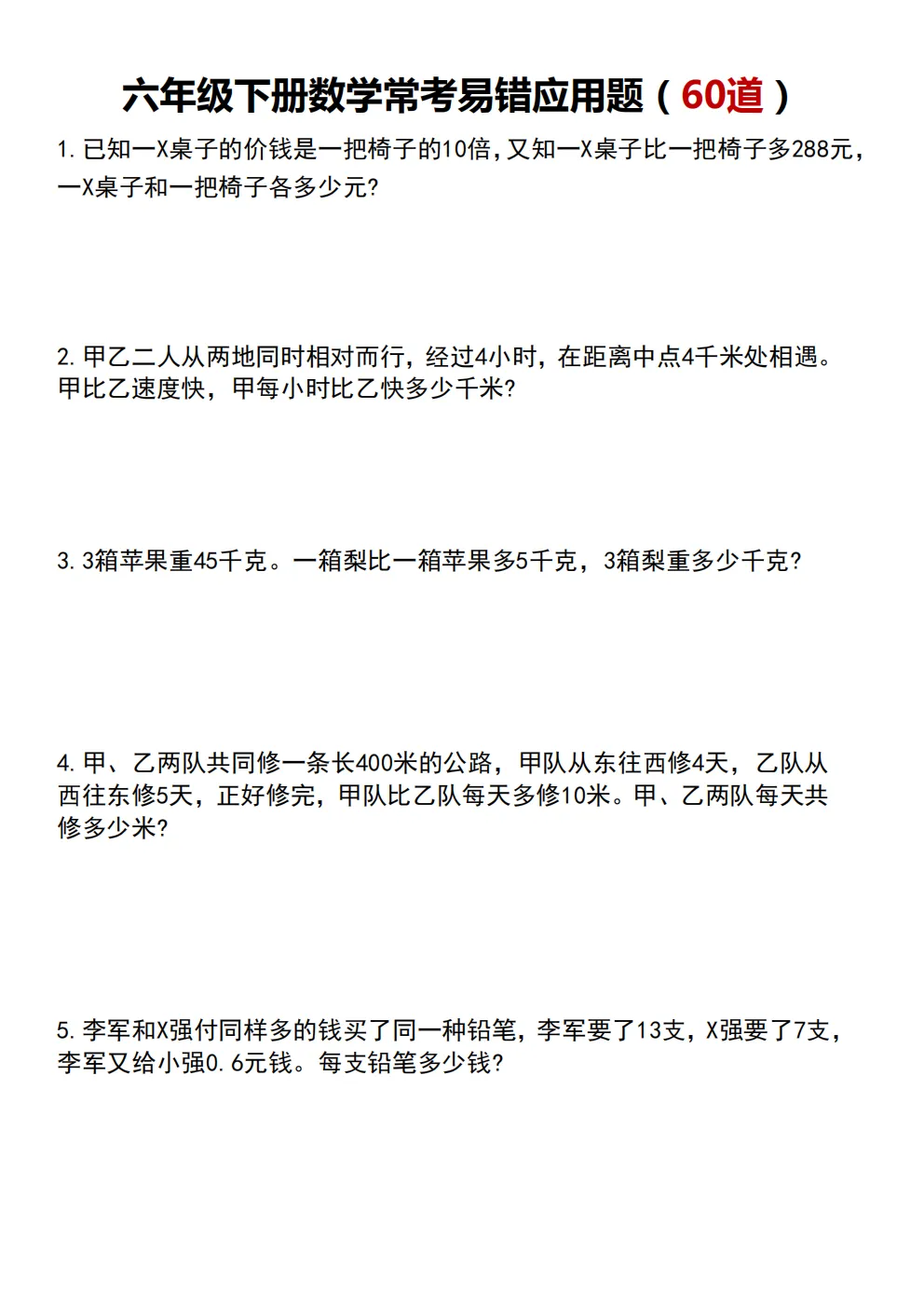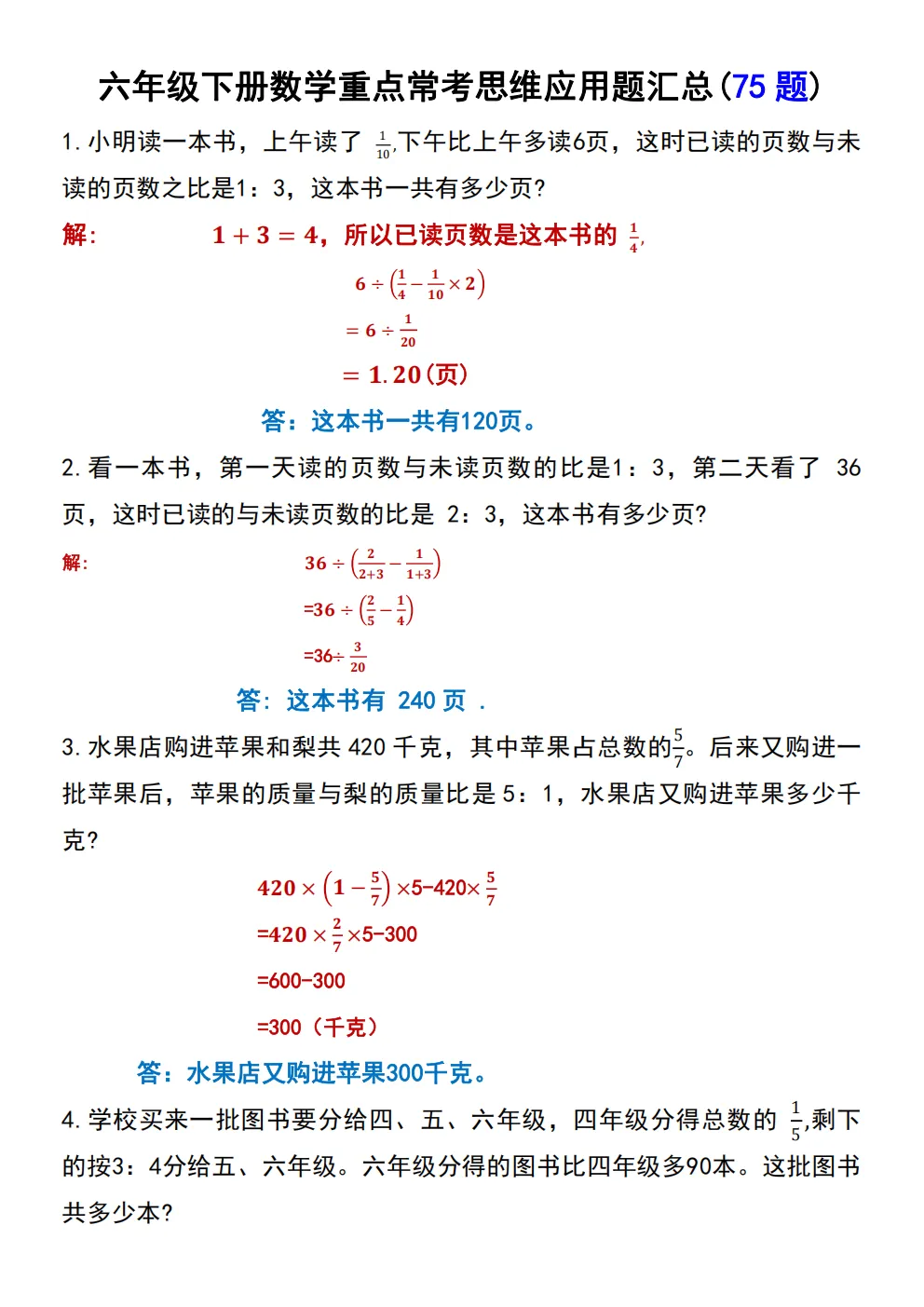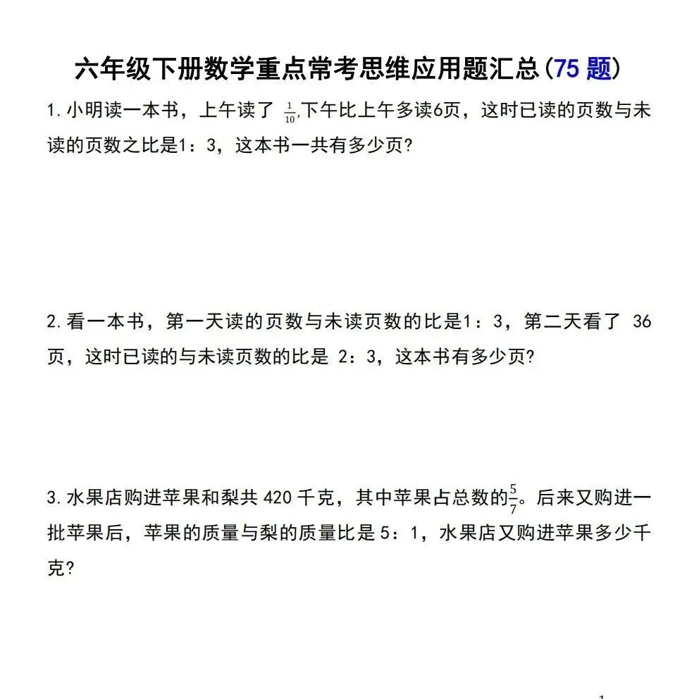 【免费下载】26春六年级下册数学|重点思维应用题75道|附答案 | PDF高清电子版可打印