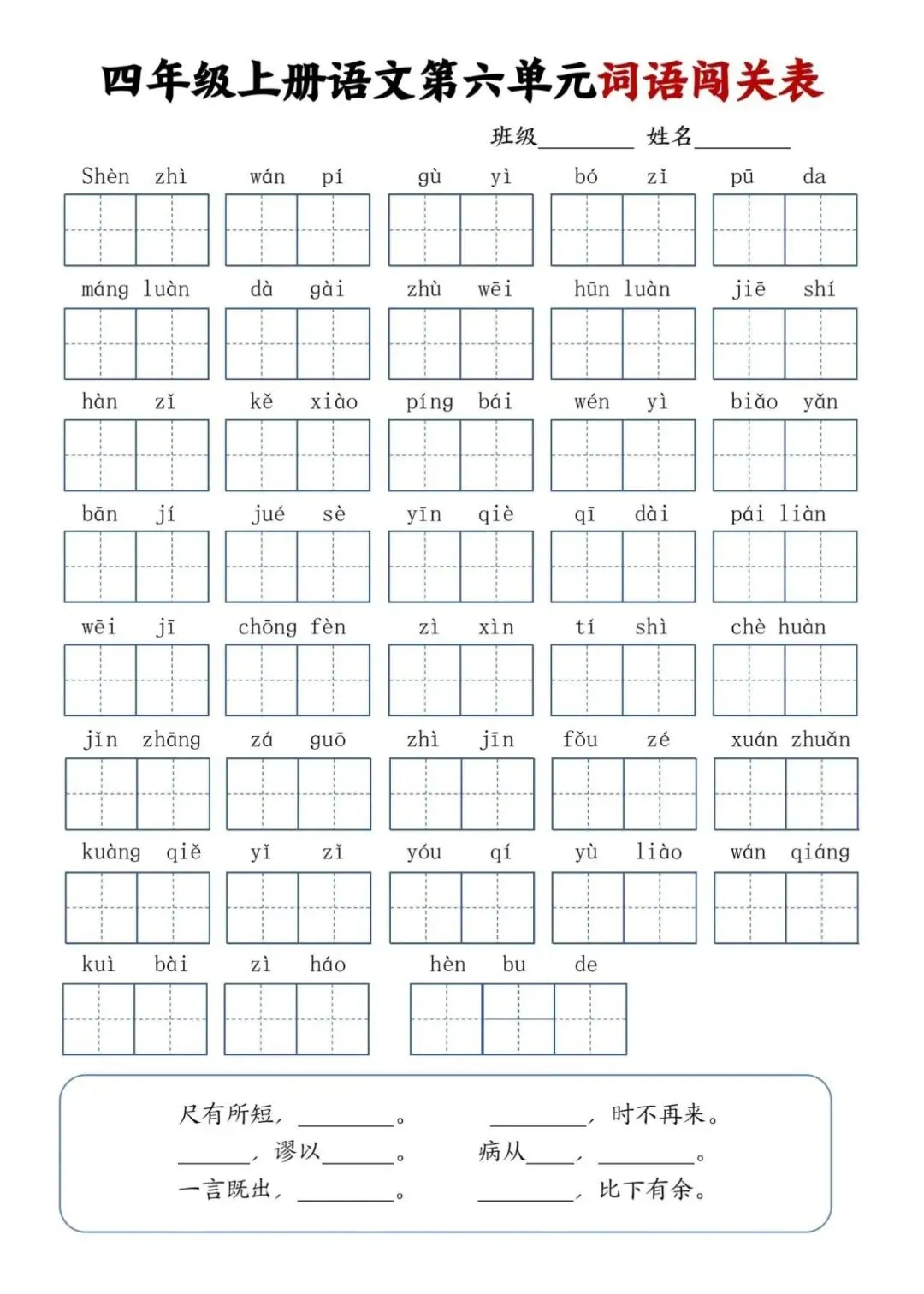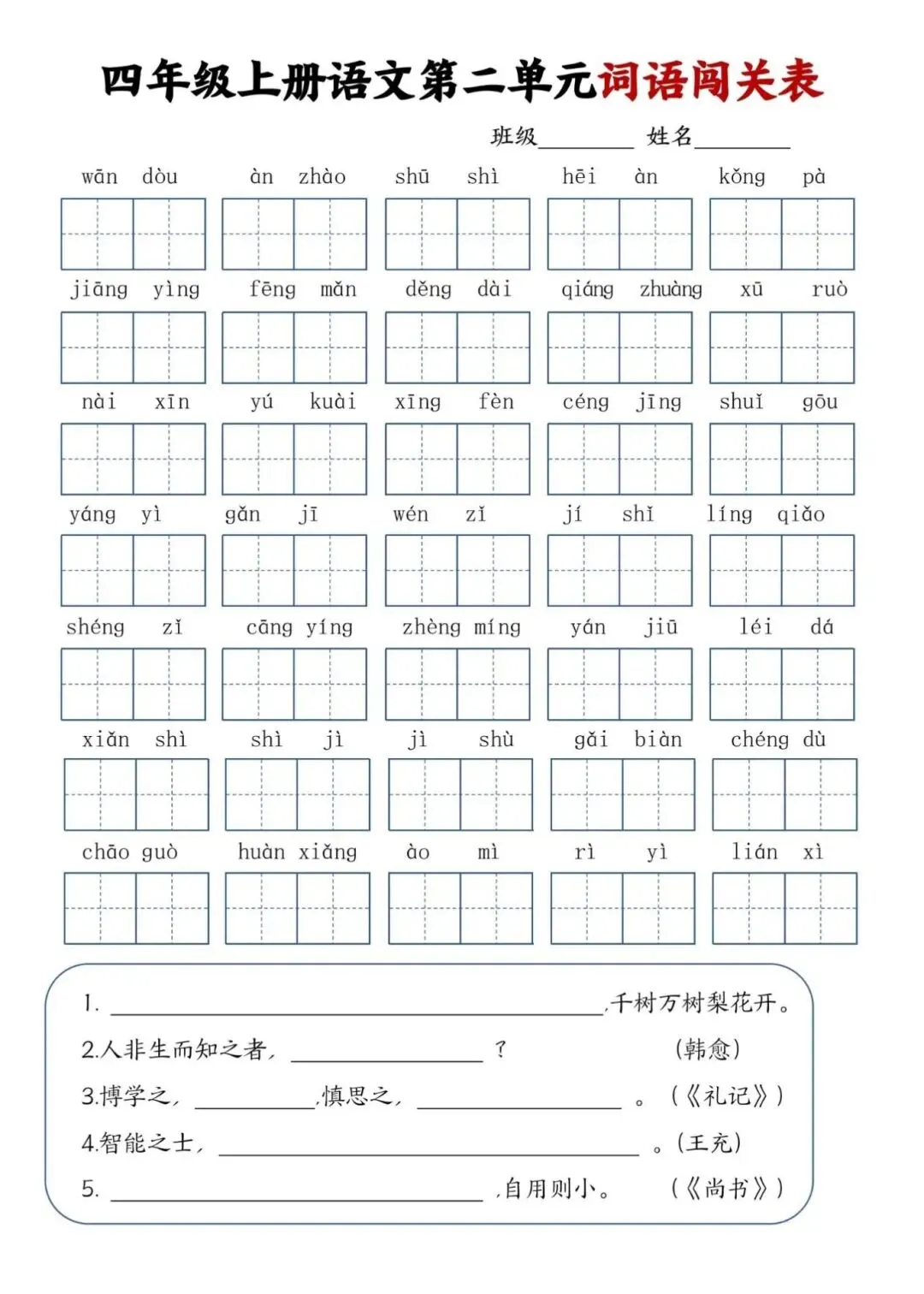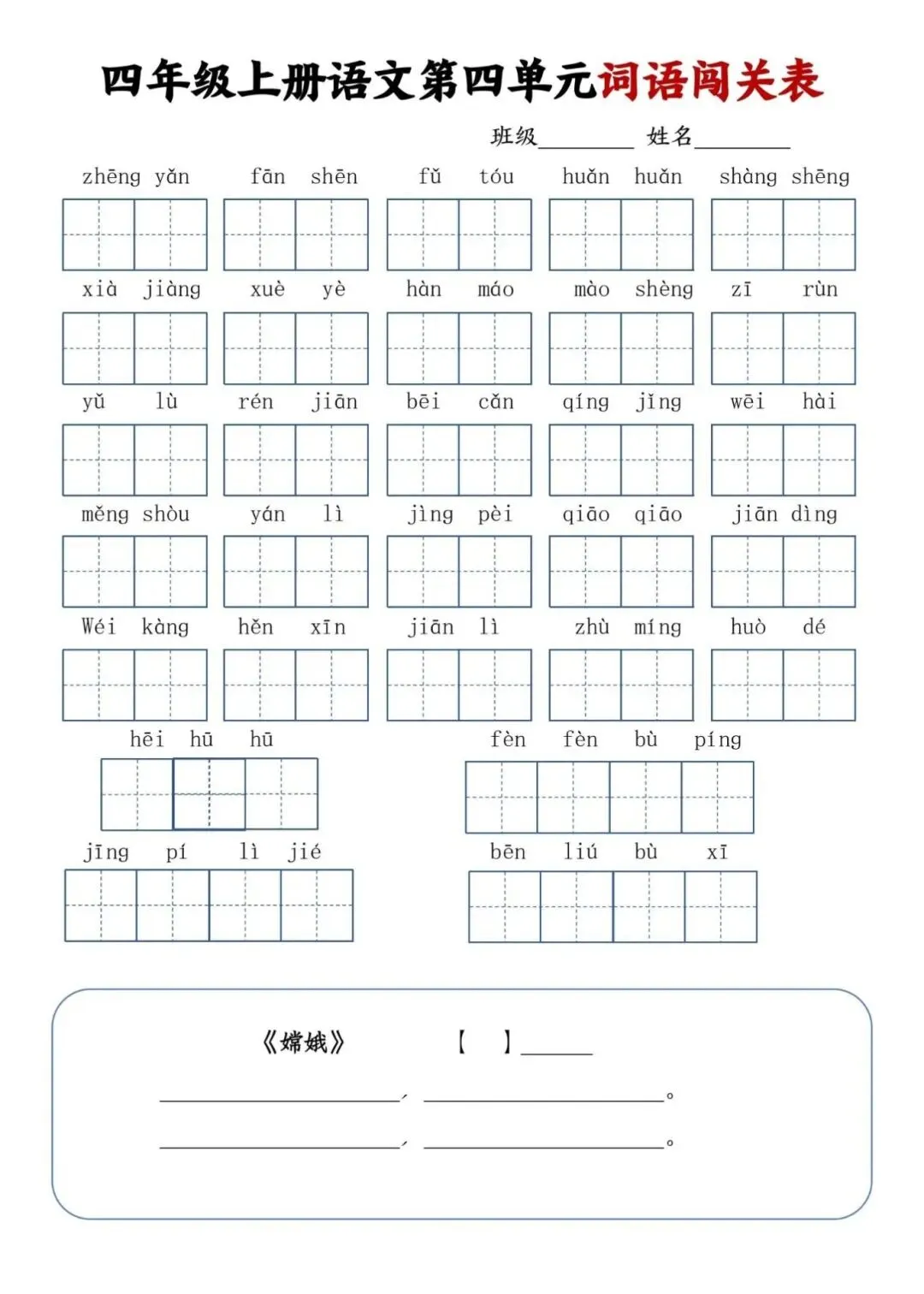 四年级上册语文单元词语闯关表,电子版可下载打印