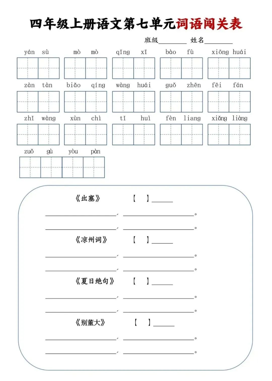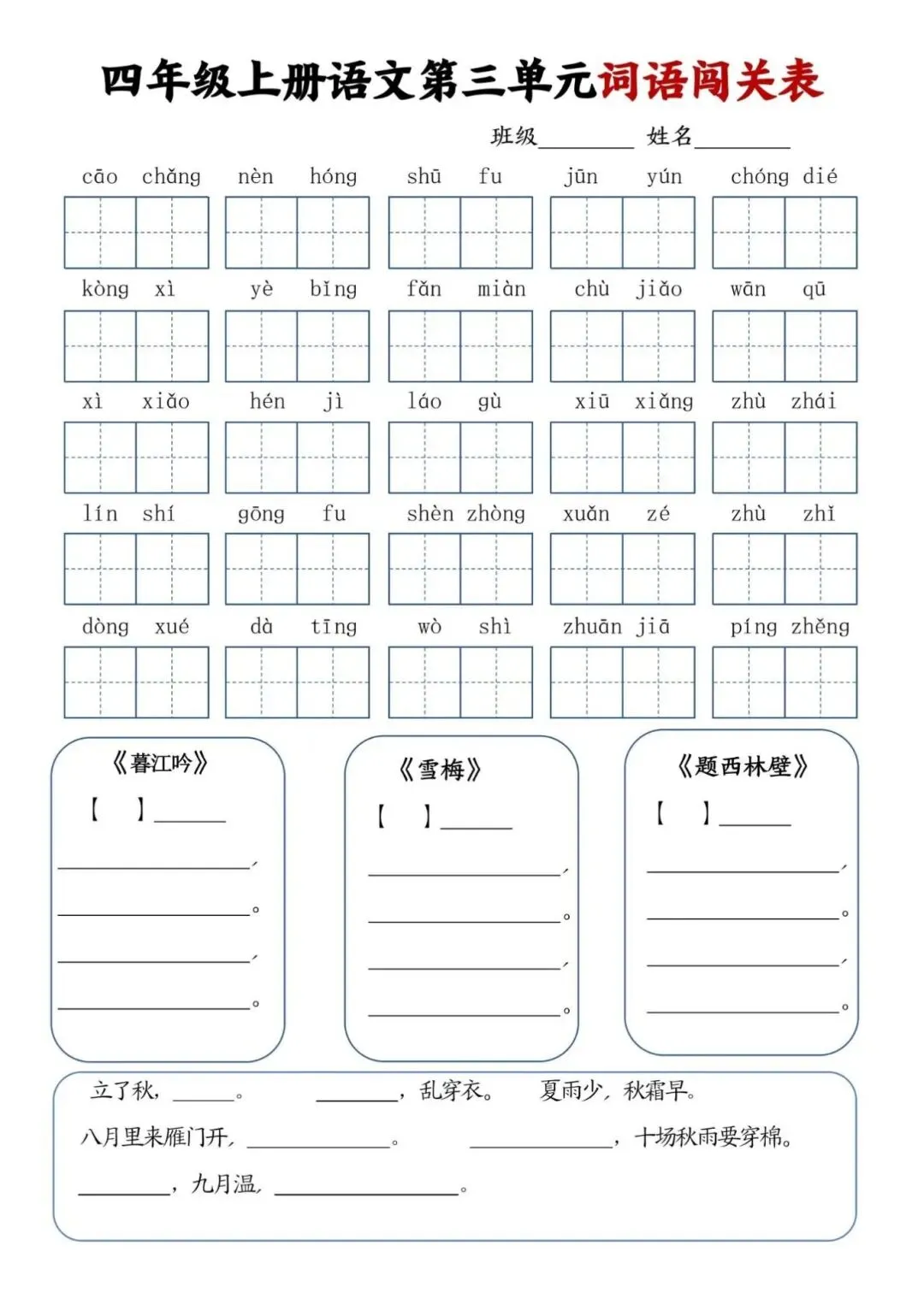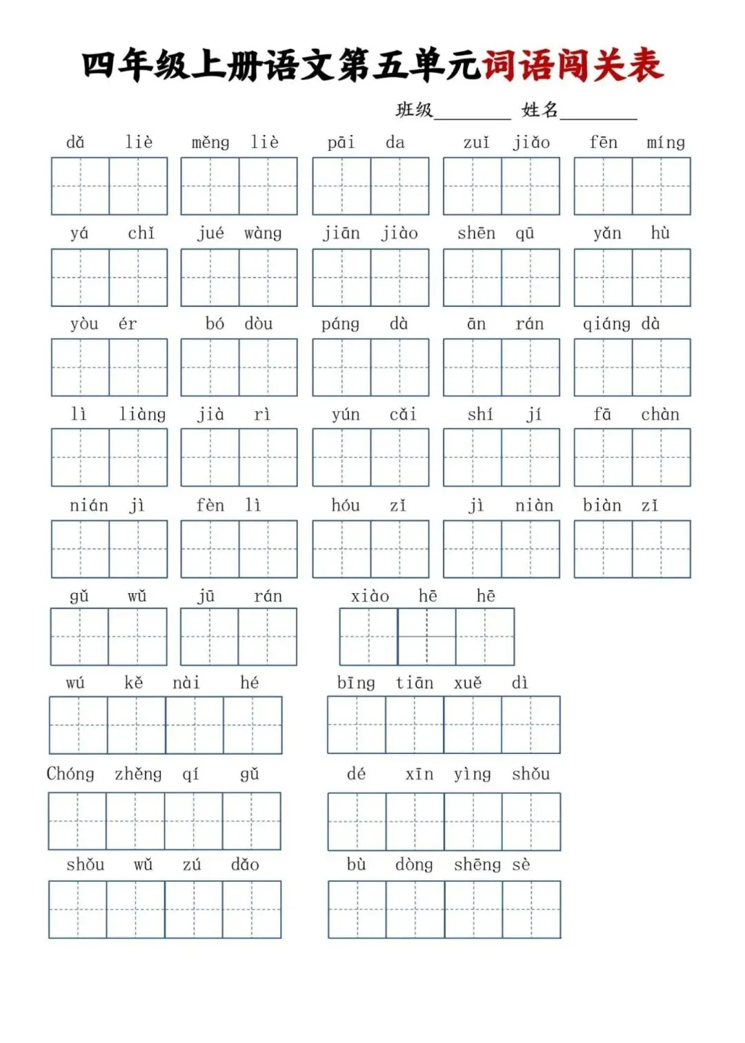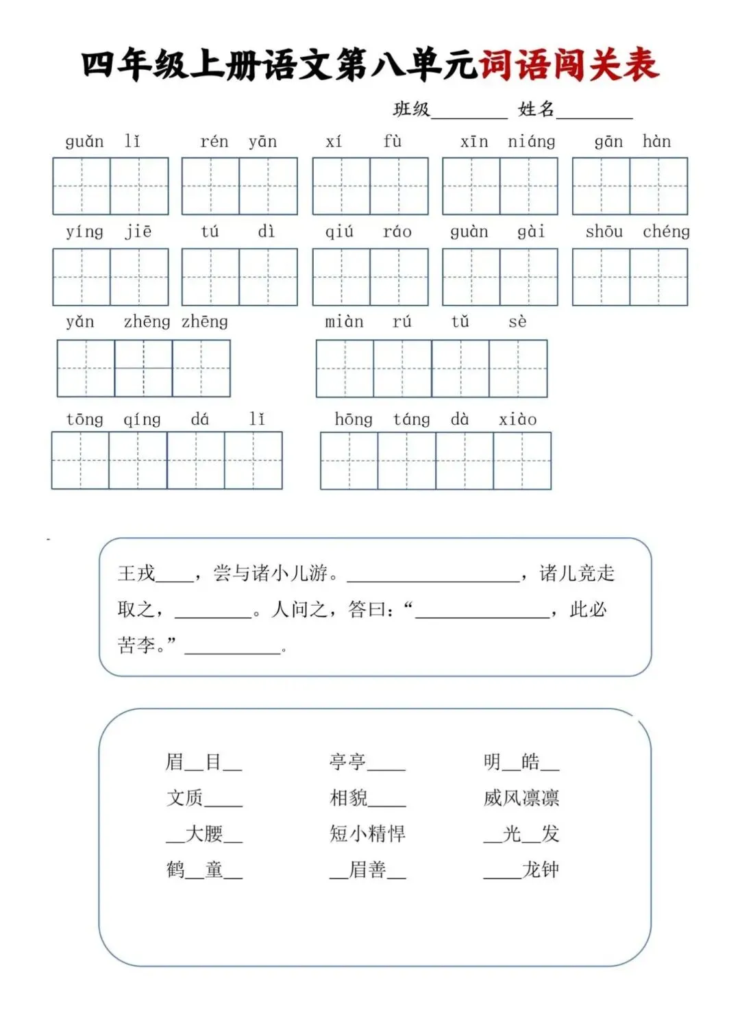 四年级上册语文单元词语闯关表,电子版可下载打印