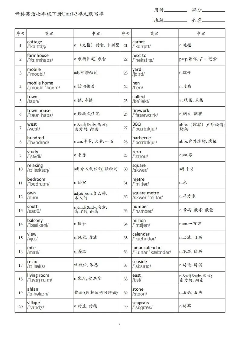 七年级下册牛津译林版英语单词背诵表,可下载打印