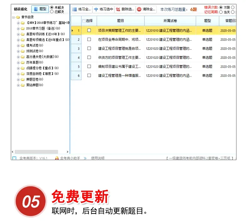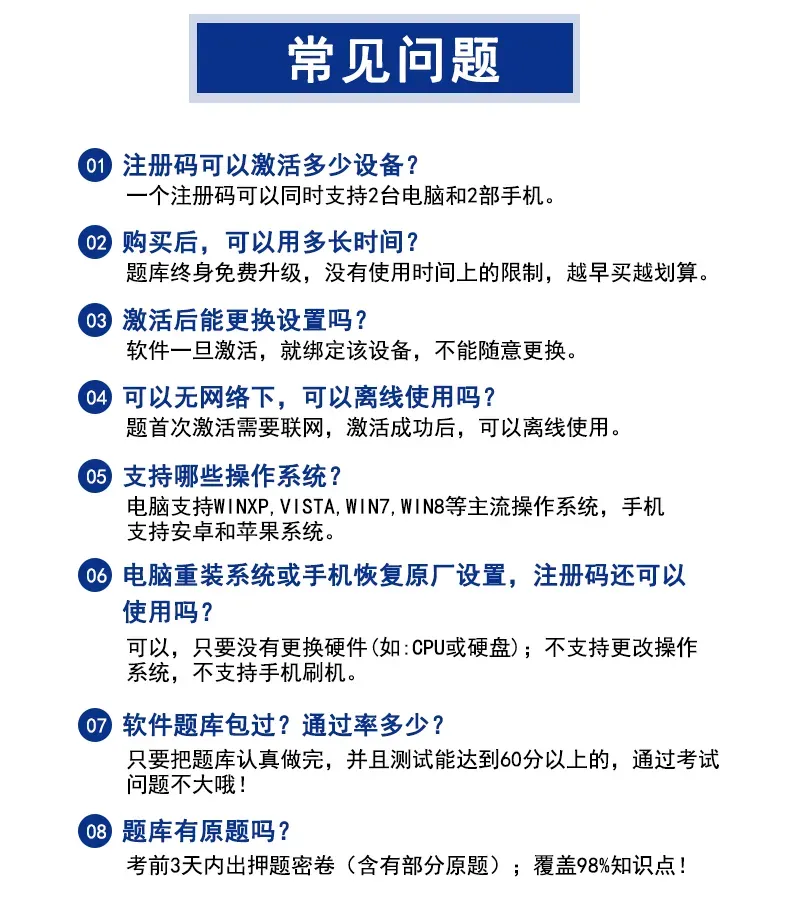 激活课程后,软件可以一直使用的(就算今年没考试,明年也可以继续用的),题库永久免费更新:只需连接网络,进入题库,如果服务器有新的题目,软件会自动下载更新的(无需操作)