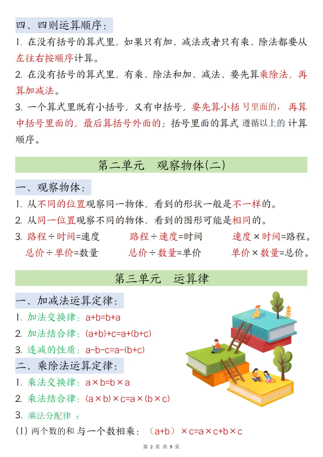 【免费下载】四年级(下)数学 寒假知识汇总《人教版》,PDF电子版,共9页,可打印