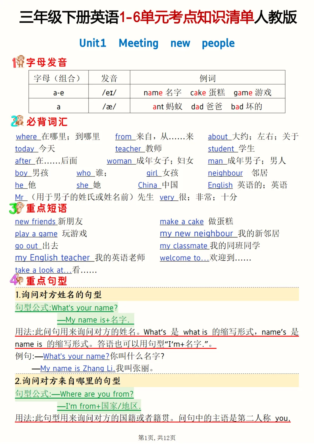 【免费下载】三年级(下)英语 1-6单元考点知识清单《人教版PEP》,PDF电子版,共12页,可打印