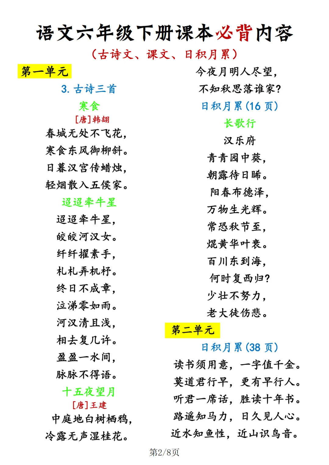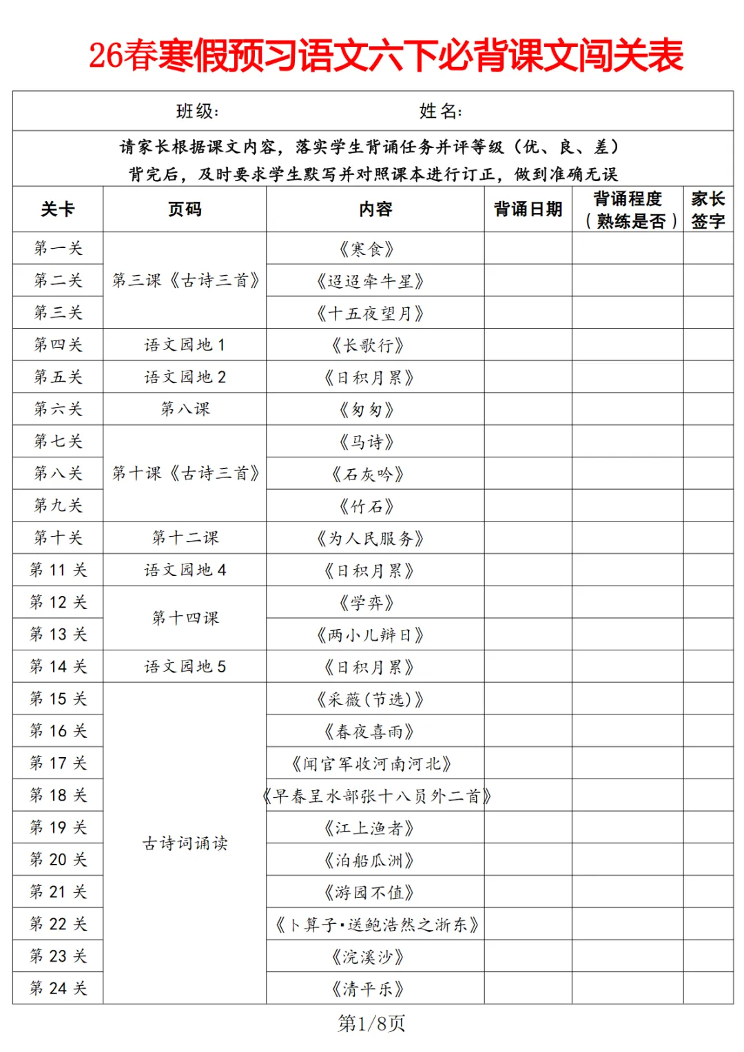 【免费下载】六年级(下)语文 寒假预习必背课文闯关表,PDF电子版,共8页,可打印