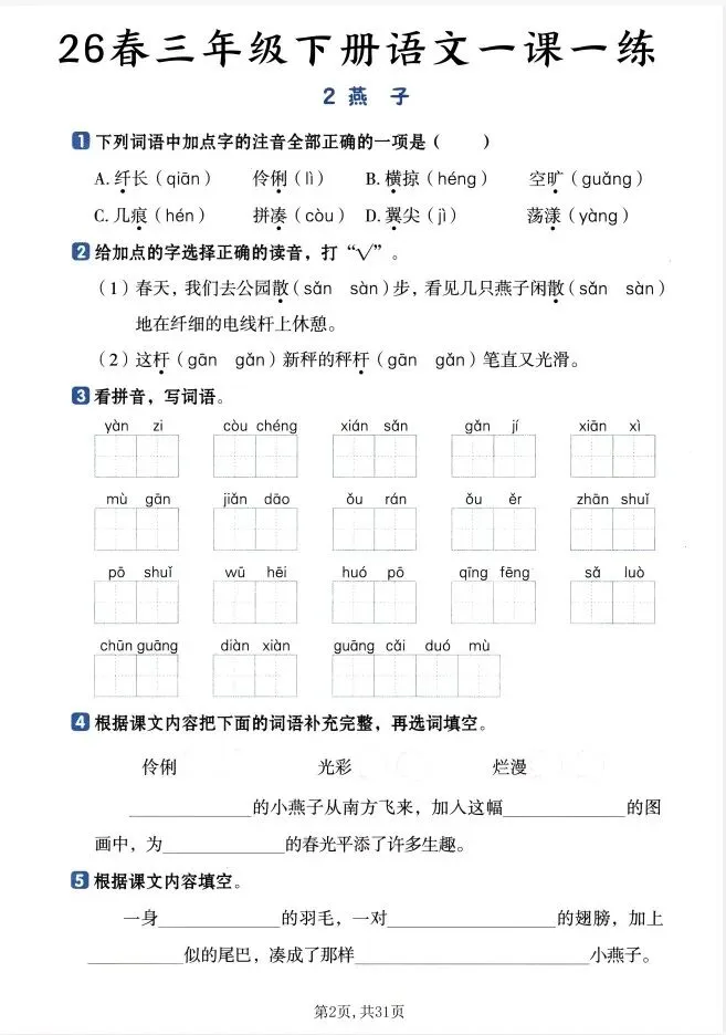 文末免费下载|26春《基础知识一课一练》语文人教1-6年级