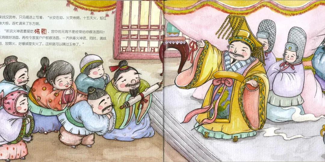 东方朔说:“听说火神君最爱吃汤圆,宫中的元宵不是经常给你做汤圆吗?十五晚上可让元宵做好汤圆,再传令家家户户都做汤圆,一齐供奉火神君。同时,满城挂灯花、点鞭炮、放烟火,好像城里失火了,这样就可以瞒住玉帝了。”
