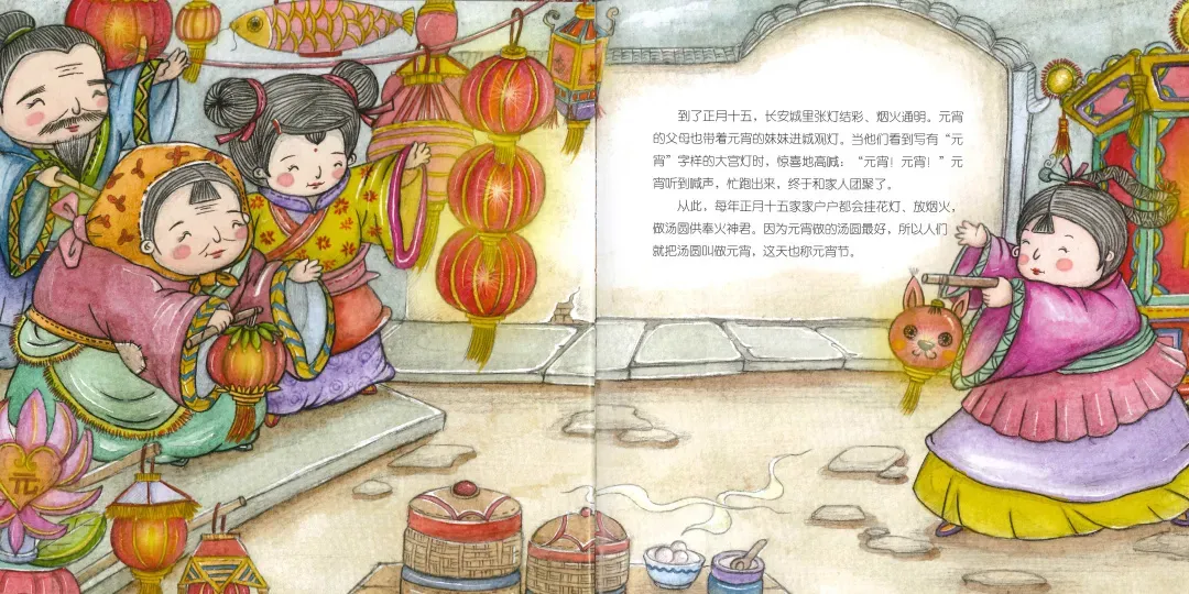 到了正月十五,长安城里张灯结彩、烟火通明。元宵的父母也带着元宵的妹妹进城观灯。当他们看到写有“元宵”字样的大宫灯时,惊喜地高喊:“元宵!元宵!”元宵听到喊声,忙跑出来,终于和家人团聚了。