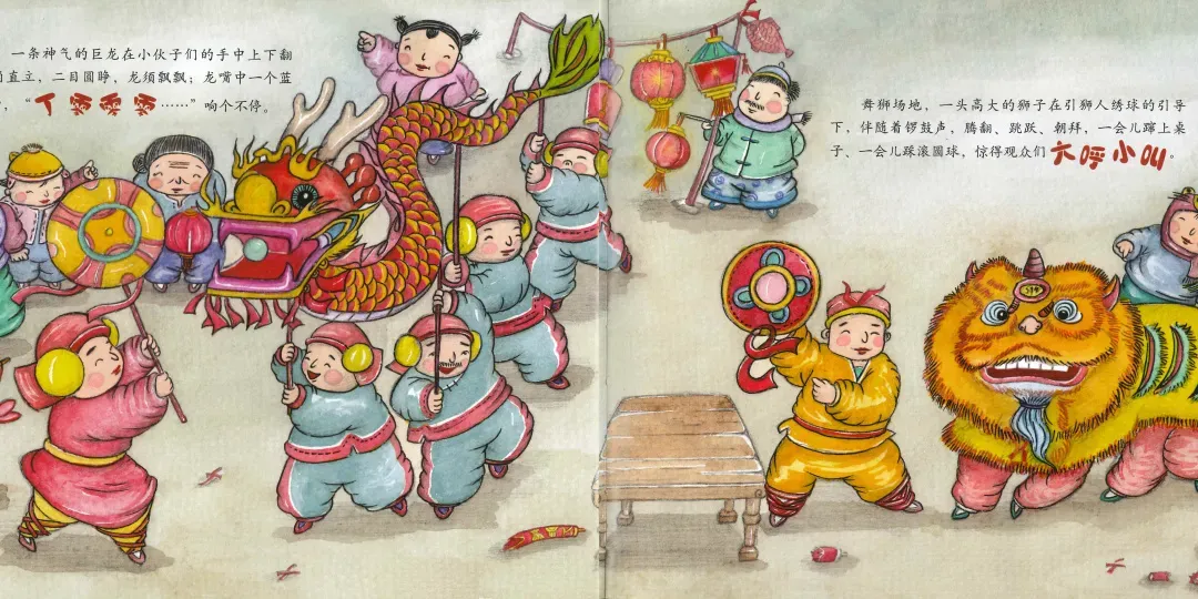 一路讲着故事,樱桃和妈妈来到了镇上。这里早已是人山人海。街道两旁,卖冰糖葫芦的、吹糖人的、卖棉花糖的……好不热闹。叫卖声、吆喝声、喊叫声,一声更比一声高。四座高台上正在上演“对台戏”。京剧、黄梅戏、秦腔、豫剧,一台比一台精彩。