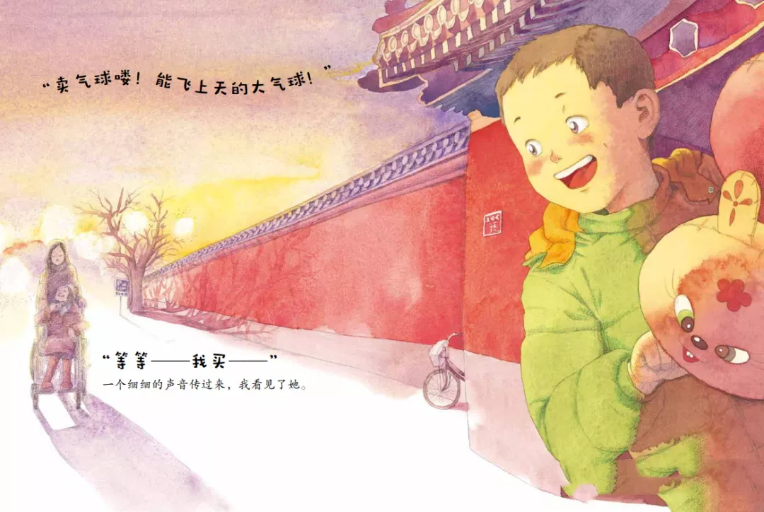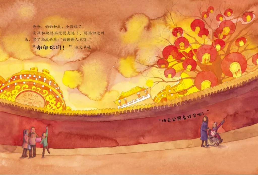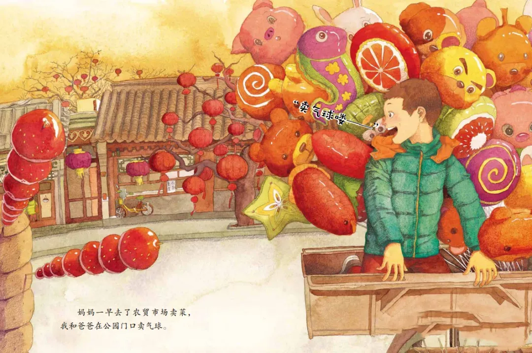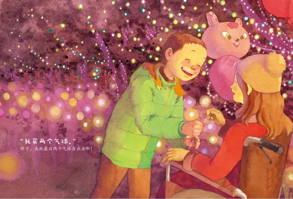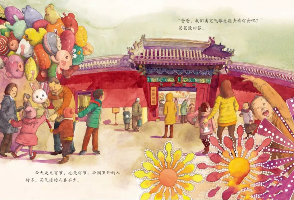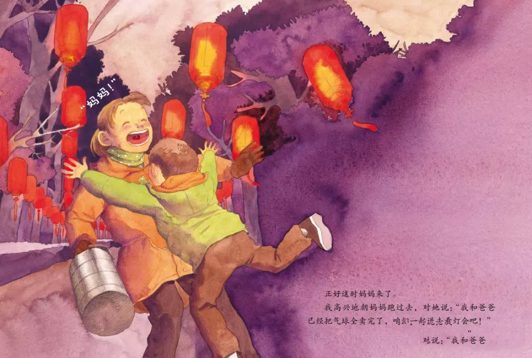 我高兴地朝妈妈跑过去,对她说:“ 我和爸爸已经把气球全卖完了,咱们一起进去看灯会吧!”