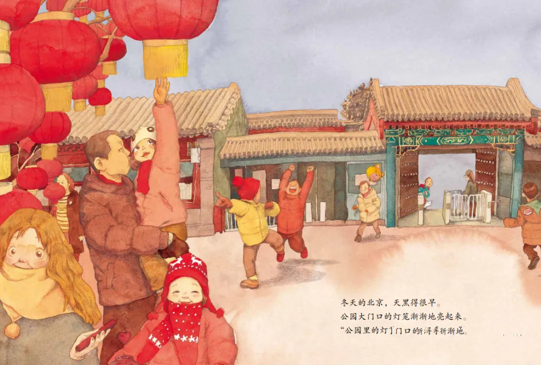 冬天的北京,天黑得很早。公园大门口的灯笼渐渐地亮起来。