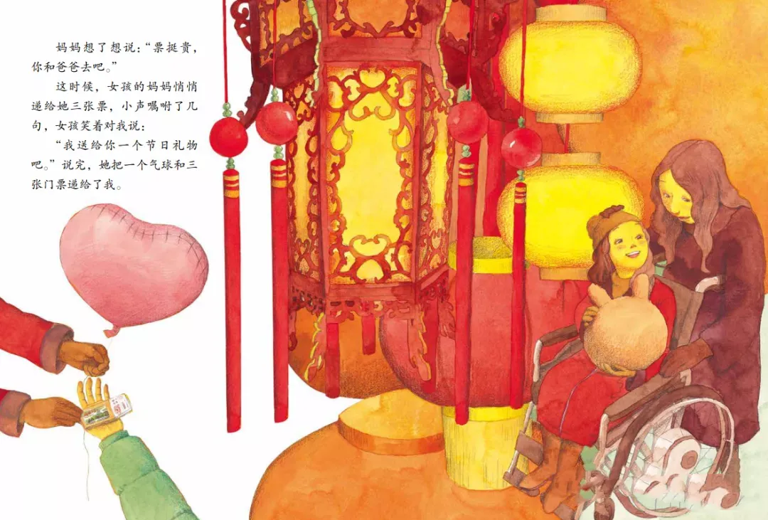 这时候,女孩的妈妈悄悄地递给她三张票,小声嘱咐了几句,女孩笑着对我说:“ 我送给你一个节日礼物吧。”说完,她把一个气球和三张门票递给了我。