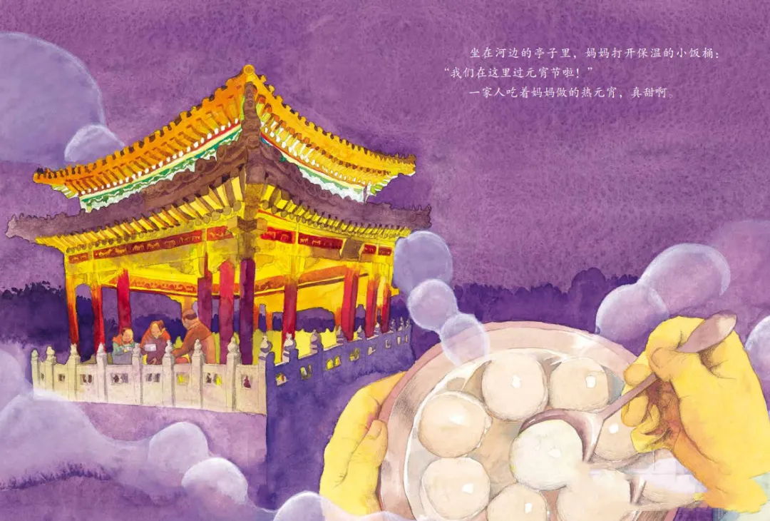 坐在河边的亭子里,妈妈打开保温的小饭桶:“ 我们在这里过元宵节啦!”