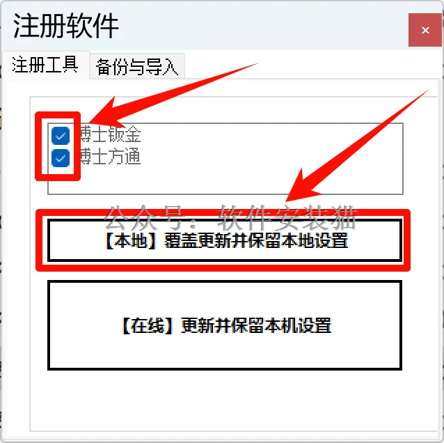 3.勾选【博士钣金】和【博士方通】;点击【【本地】覆盖更新并保留本地设置】