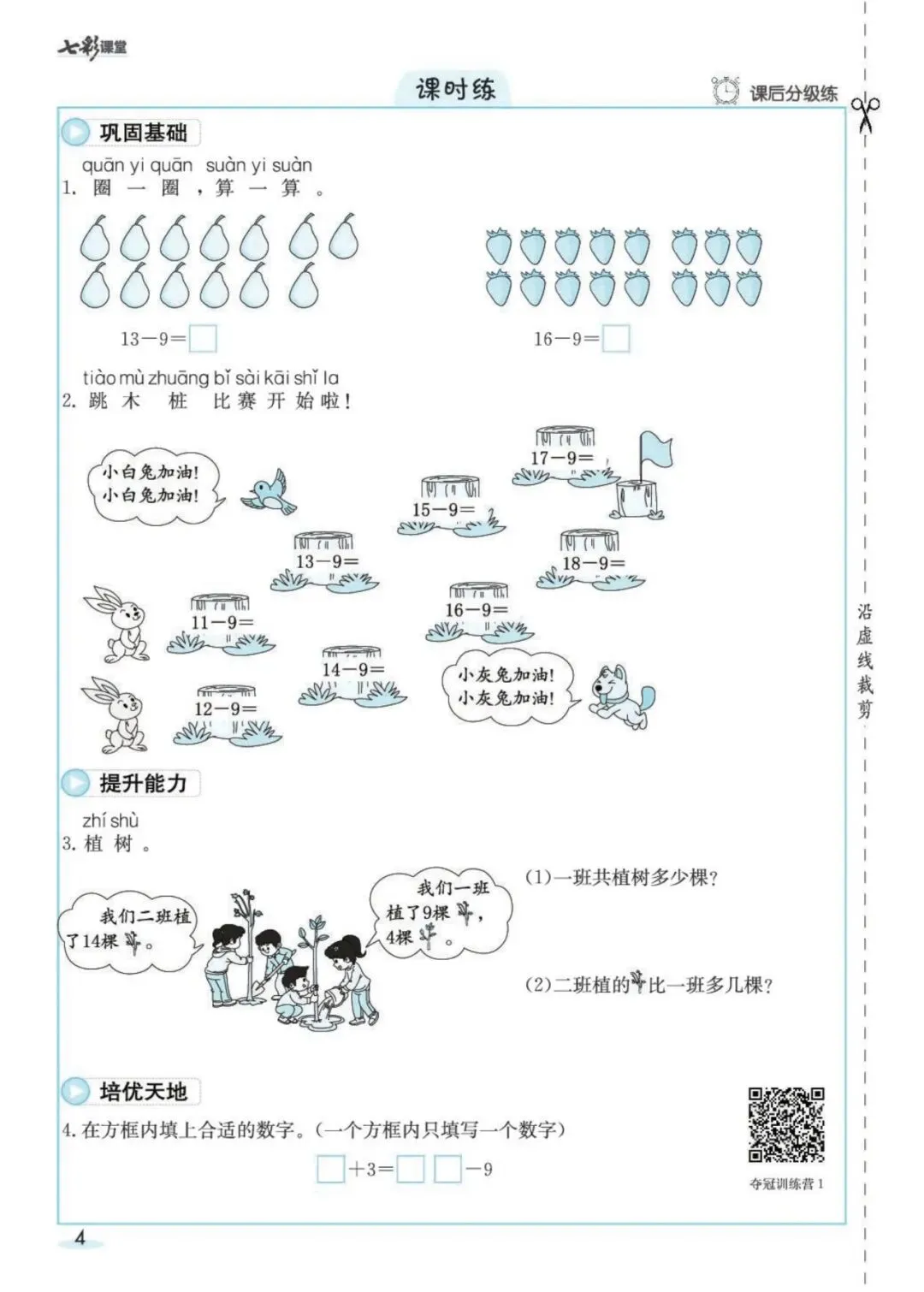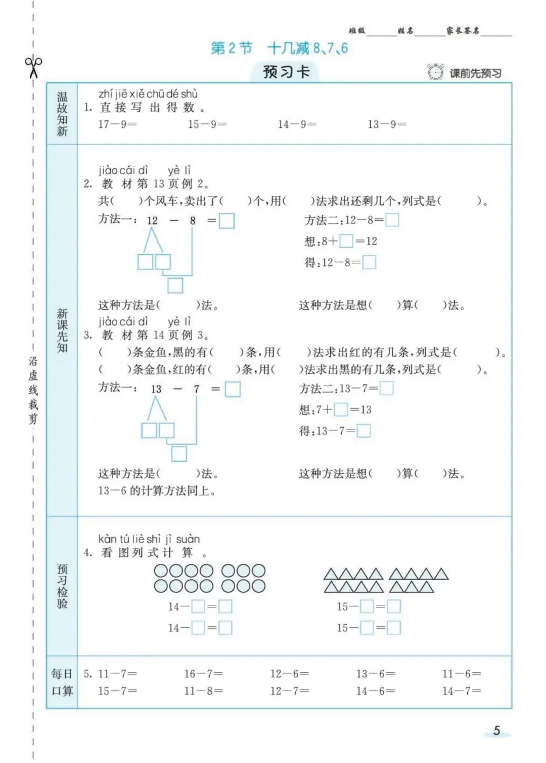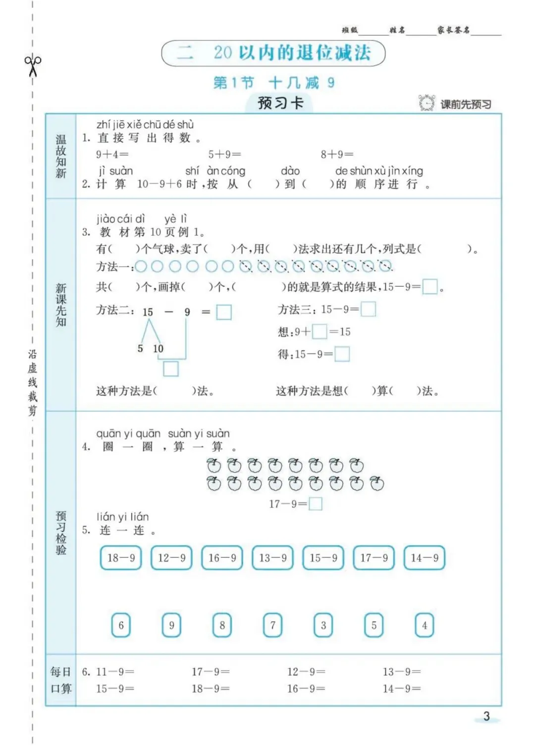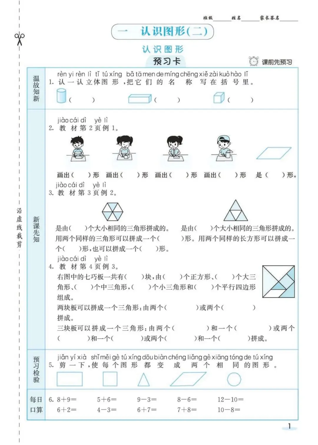 《人教版数学1年级《预习卡+课课练》》可免费下载打印