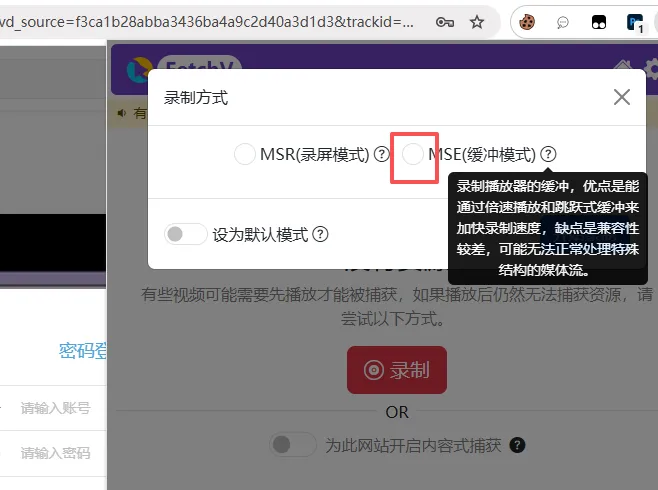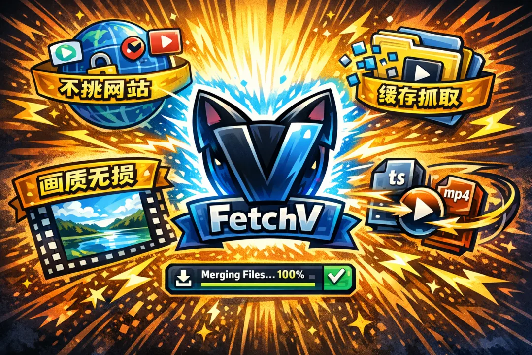 我从网上找到了一个和我一样想法的开发者做的工具,【FetchV】直接拦截浏览器的请求,把一段一段视频缓存下来,最后再给你输出合成完整的视频。
