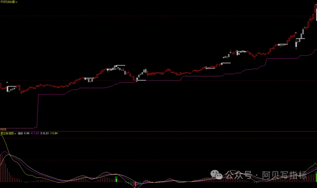 ·当RSI1上穿21,似七星归位,多头号角响(灰色K线+红色剑气)。