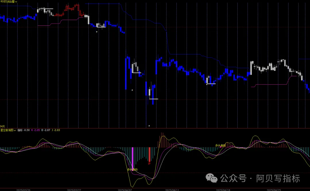 ·RSI1(7周期):如北斗七星,指引方向。当RSI1下破79,如七星坠地,空头信号现(灰色K线+蓝色剑气);