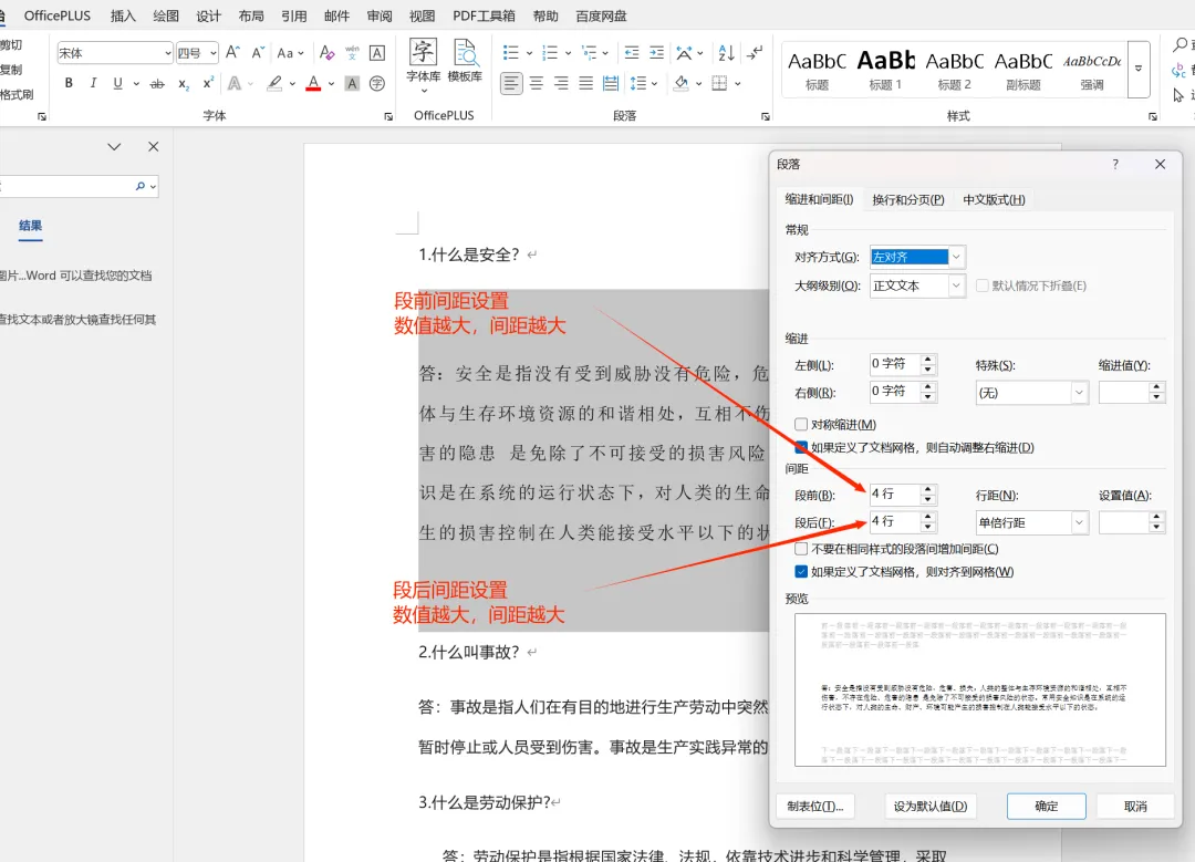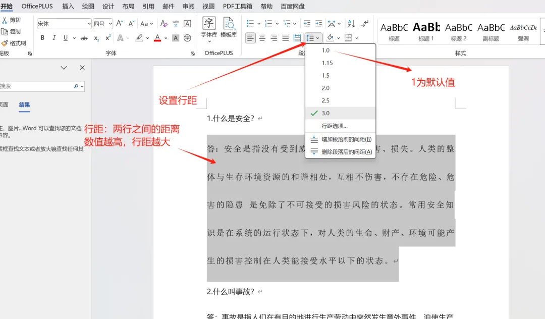 – 行距设置:打开Word文档,选中需要设置行距的段落,在“开始”功能区的“段落”分组中单击“行距”按钮,并在打开的行距列表中选中合适的行距。