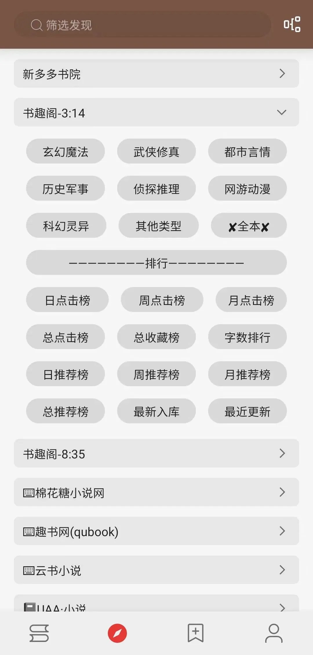 软件是不用登录的,也没有广告,不过软件打开后和其他软件的区别还是很大的,没有其他软件的什么榜单分类等,是直接将所有书源、漫画源给展示出来,每个书源、漫画源点开后都会有对应书源,想看哪个源直接点就行。