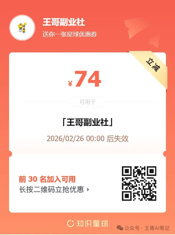 目前我创建了一个知识星球,里边有各种网创项目,目前春节优惠,加入知识星球,智能体变现项目免收代理费,直接以会员价格拿智能体卡密,另外赠送一个公众号流量主智能体卡密。只有30个名额。截止时间2月28日。