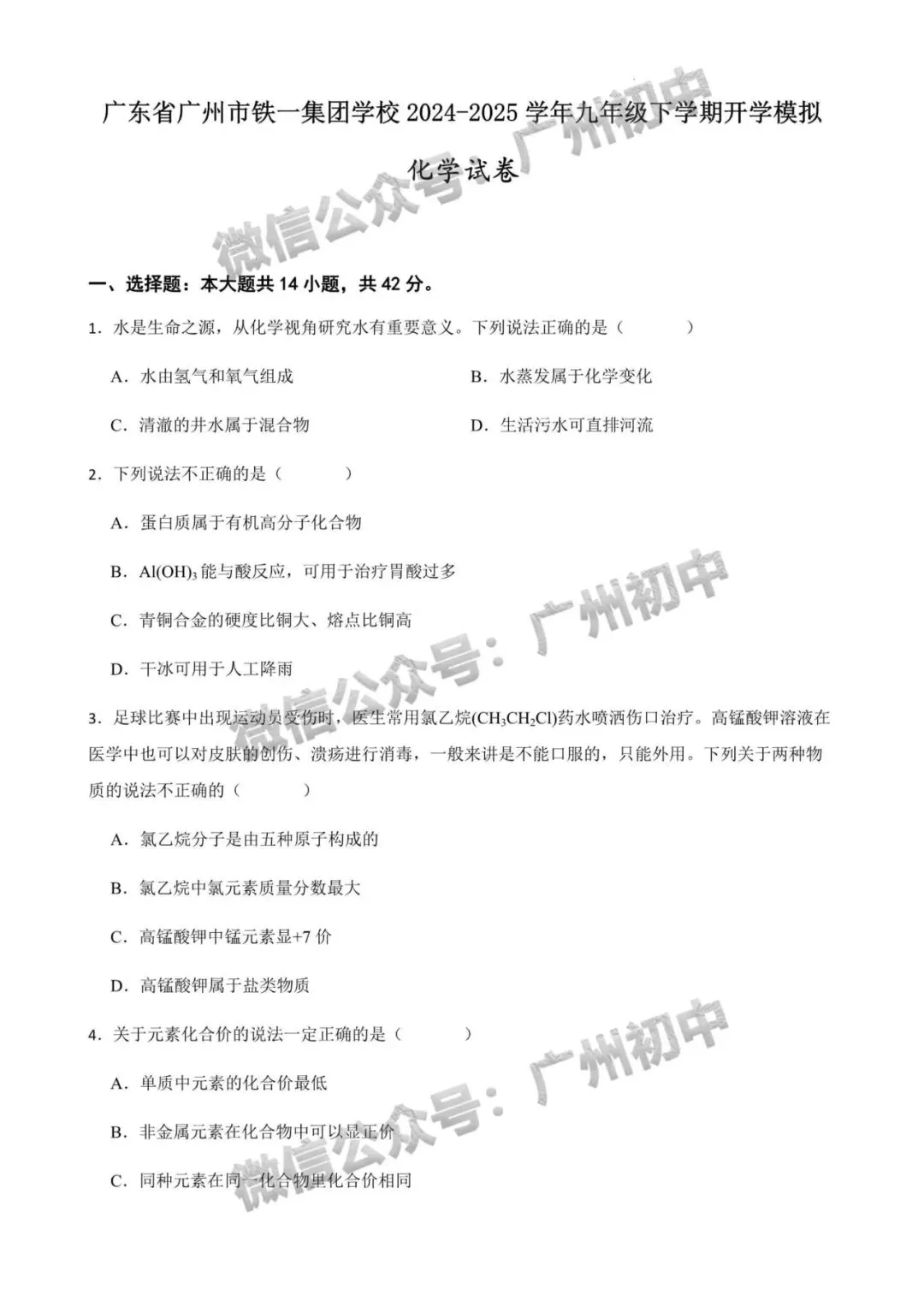 7、广州市铁一集团学校2024-2025学年九下开学模拟化学试题及参考答案