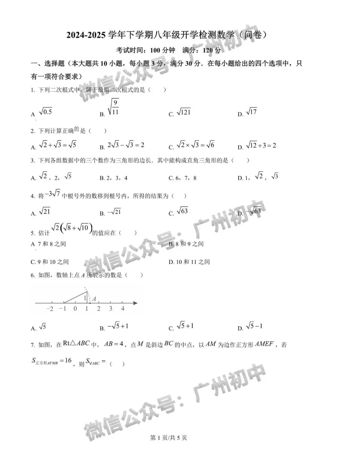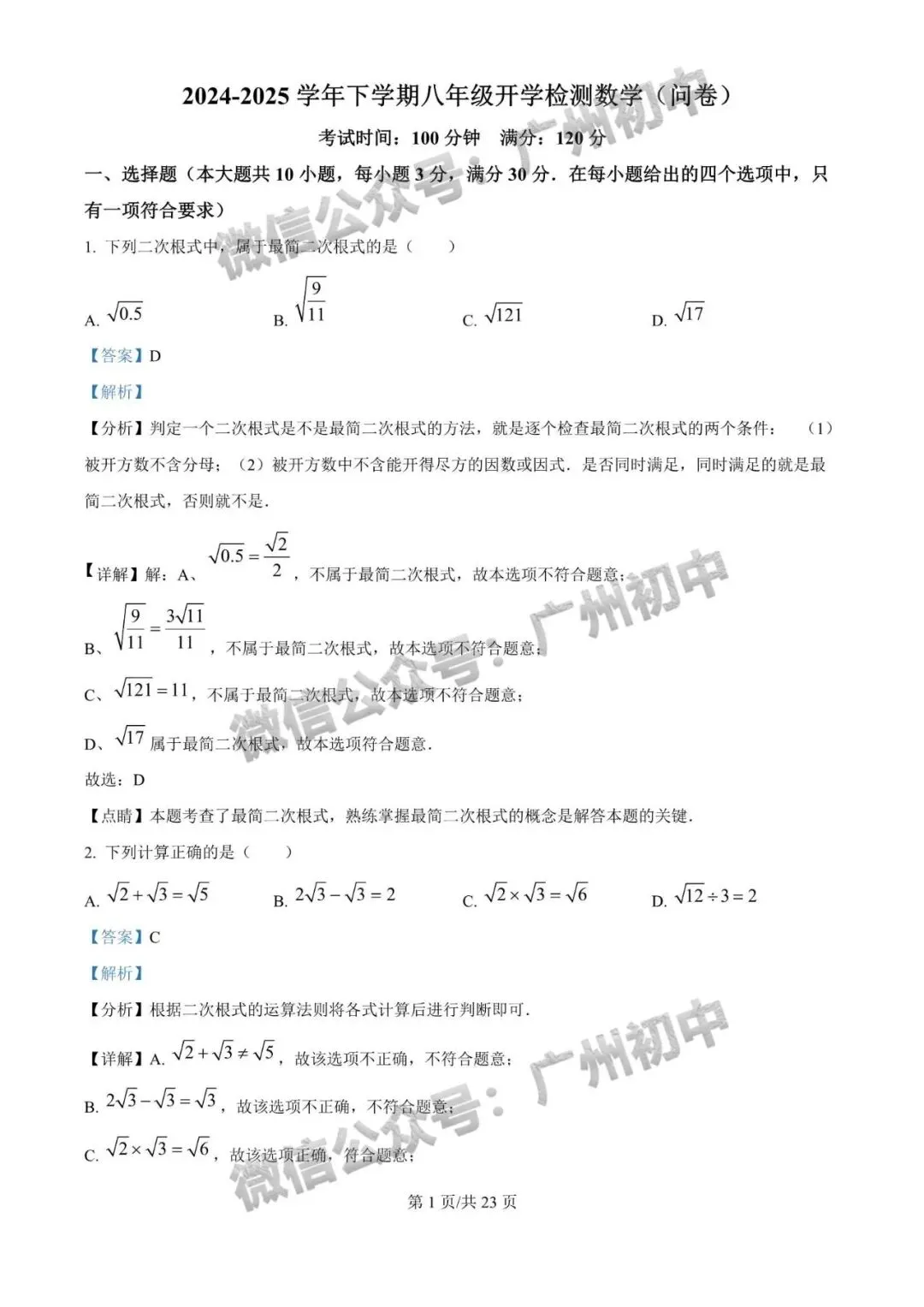 1、广州大学附属中学2024-2025学年八下开学考试数学试题及答案解析