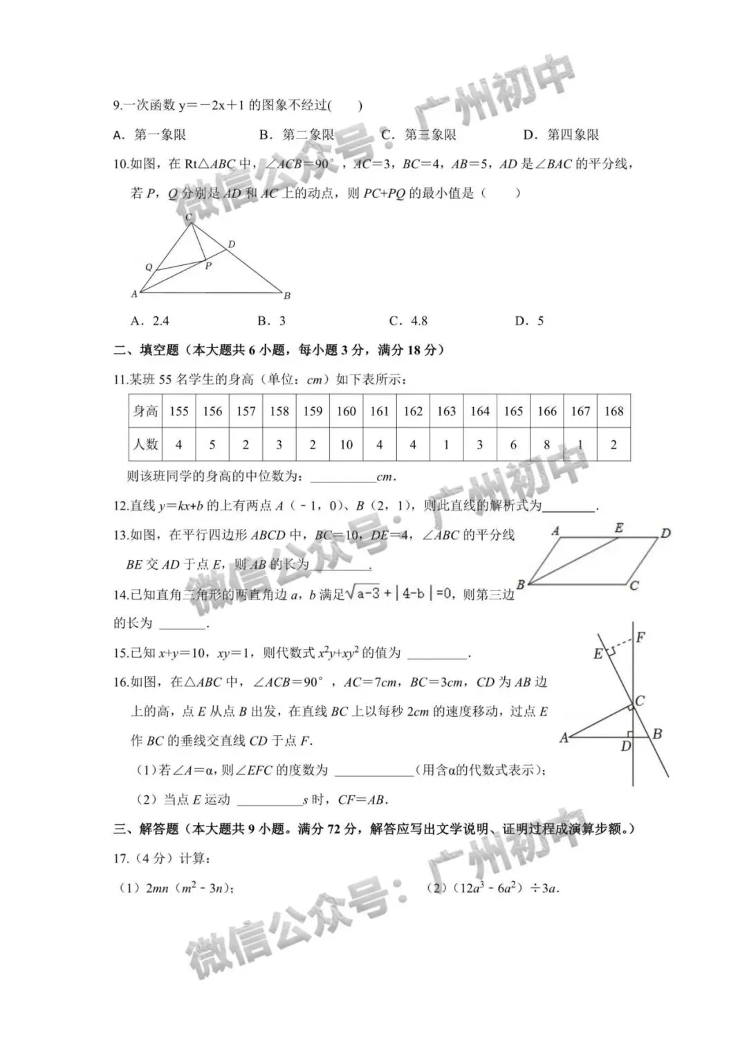 2、天河外国语学校2024-2025学年八下数学开学考试题