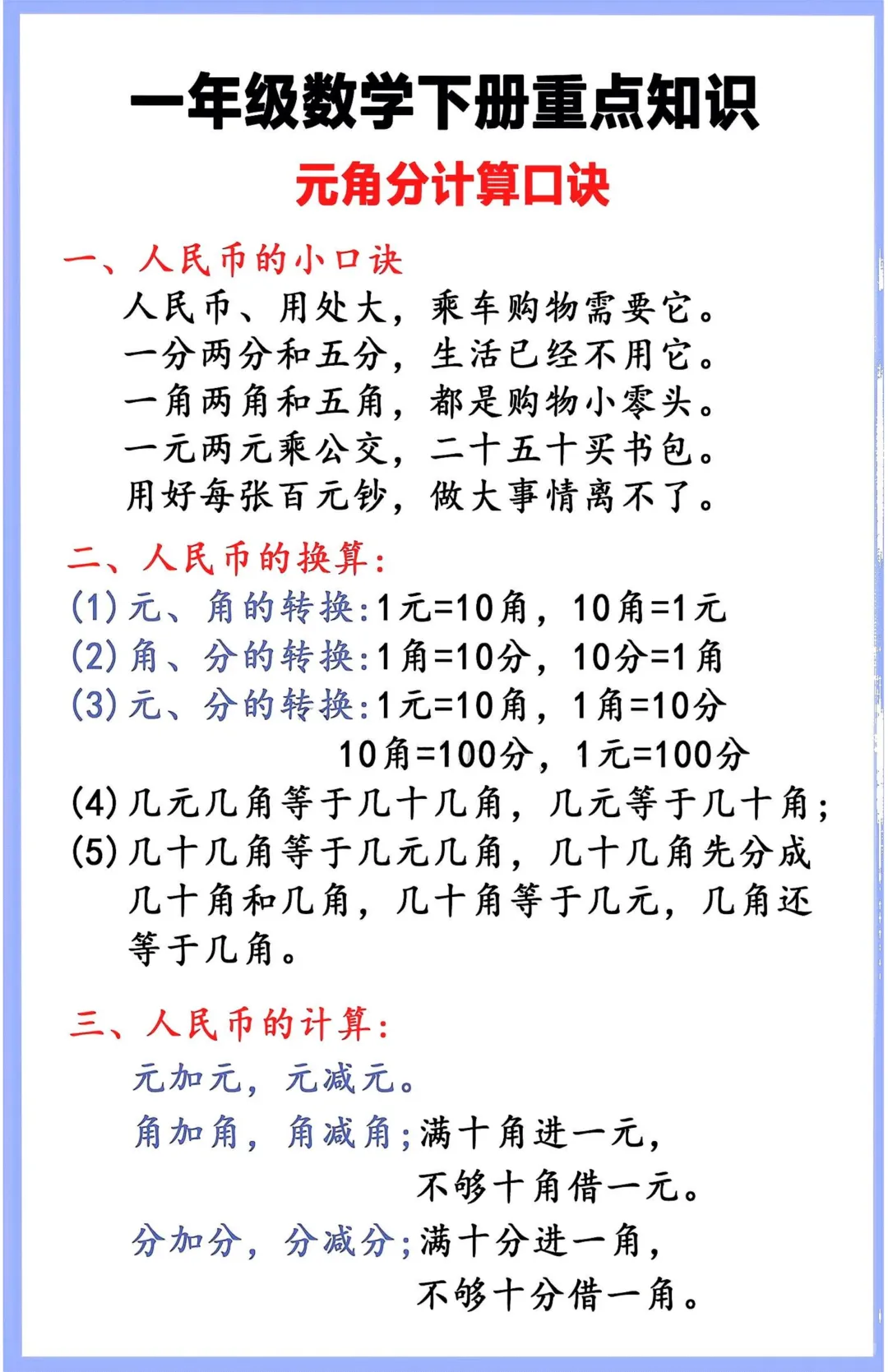 今天为大家分享:小学一年级是数学思维启蒙的关键阶段,尤其是下册的人民币认知与计算,更是孩子们容易混淆、丢分的重灾区。很多家长反映,孩子能背下 “1 元 = 10 角”,可一到实际计算 “买东西找零”“几元几角相加减”,就频频出错,数位认知和加减公式的运用也不够熟练。