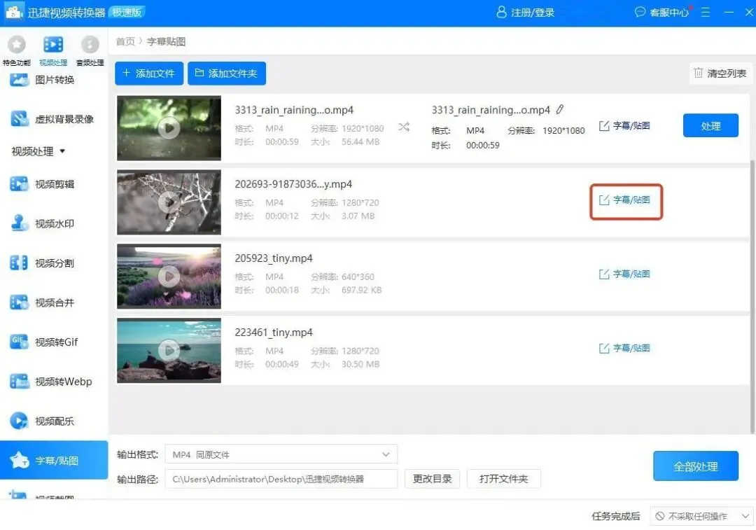 在这里可以点击【+字幕文件】,导入字幕,软件就会自动将字幕放置在视频中,完成后点击【确定】,回到上一个界面中点击【全部处理】即可。