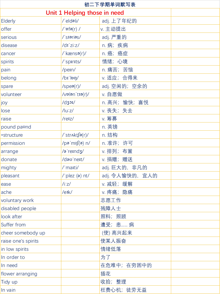 沪教新版英语初二下册单词表2026春(电子版) 帮孩子整理了一份沪教新版英语八年级下册单词默写表,需要的亲收藏关注给孩子用吧! 关注本公众号,后台回复“初中英语”、“小学英语” 可下载各年级单词默写表电子版 八下英语单词默写表(2026春新版) 需要初1-9年级单词默写表电子版的亲,请关注本公众号,点击下边链接下载: 1、初一单词新版(上).xlsx 2、初一单词新版(下).xlsx 3、初二上册单词表默写-中译英.pdf(2025秋) 4、初二上册单词表默写-看音标默写.pdf(2025秋) 5、初二英语单词默写表(2025-2026).xlsx 6、初三英语单词表.xlsx 7、六年级单词默写表.xlsx 8、五年级单词默写表.xlsx 9、四年级英语单词默写表.xlsx 10、三年级英语单词默写表.xlsx 致力于育儿分享,欢迎点赞+关注哦!